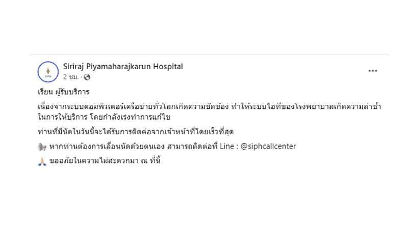 นอกจากนี้ยังพบว่า เพจ Siriraj Piyamaharajkarun Hospital โรงพยาบาลศิริราช ปิยมหาราชการุณย์ ก็เจอปัญหาเดียวกัน โดยระบุว่า เรียน ผู้รับบริการ เนื่องจากระบบคอมพิวเตอร์เครือข่ายทั่วโลกเกิดความขัดข้อง ทำให้ระบบไอทีของโรงพยาบาลเกิดความล่าช้าในการให้บริการ โดยกำลังเร่งทำการแก้ไข ท่านที่มีนัดในวันนี้จะได้รับการติดต่อจากเจ้าหน้าที่โดยเร็วที่สุด