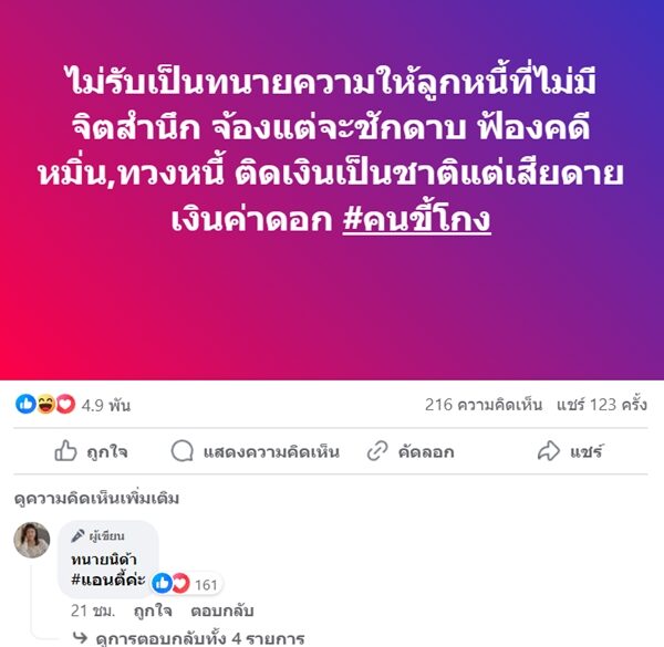 "ไม่ได้สนับสนุนให้เจ้าหนี้โพสต์ทวงหนี้นะคะ เพราะมันเข้าข่ายหมิ่นประมาทได้อยู่ แม้จะไม่เห็นด้วยก็ตามแต่ก็แนะนำให้ปฏิบัติตามกฎหมาย เดี๋ยวจะกลายเป็นหนี้ก็ไม่ได้ โดนฟ้องเป็นจำเลยอีก"