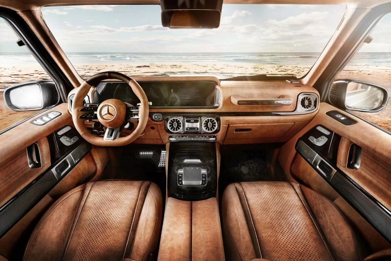 Carlex ซึ่งเป็นผู้เชี่ยวชาญด้านการตกแต่งภายในชั้นนำ ได้ปรับปรุงห้องโดยสารของ G-Wagon ด้วยเช่นกัน โดยแทบทุกแผงหุ้มด้วยหนังวินเทจและ Alcantara มีให้เลือก 3 สี สไตล์ของหนังวินเทจนี้ช่วยเพิ่มความรู้สึกย้อนยุคให้กับรถ 4×4 และเข้ากันได้เป็นอย่างดี นอกจากนี้ ผู้ปรับแต่งยังได้สร้างสรรค์พื้นที่เก็บสัมภาระด้านหลังของ G-Class อีกด้วย โดยประดับพื้นด้วยแผงไม้ ซึ่งเป็นคุณลักษณะที่เลียนแบบมาจากด้านหลังของเบาะหลัง