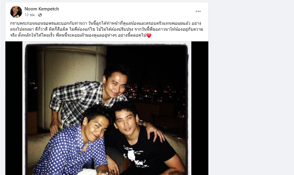 นอกจากนี้ยังโพสต์อีกว่า "กราบพระก่อนนอนขอพรและบอกกับท่านว่า วันนี้ลูกได้ทำหน้าที่ดูแลน้องและครอบครัวแทนพ่อแม่แล้ว อย่างตรงไปตรงมา ดีก็ว่าดี ผิดก็คือผิด ไม่ดีต้องแก้ไข ใช้ไม่ได้ต้องปรับปรุง จากวันนี้พี่ขอภาวนาให้น้องอยู่กับความจริง ตั้งหลักให้ได้โดยเร็ว พี่คนนี้จะคอยเฝ้ามองดูแลอยู่ห่างๆ อย่างนี้ตลอดไป"