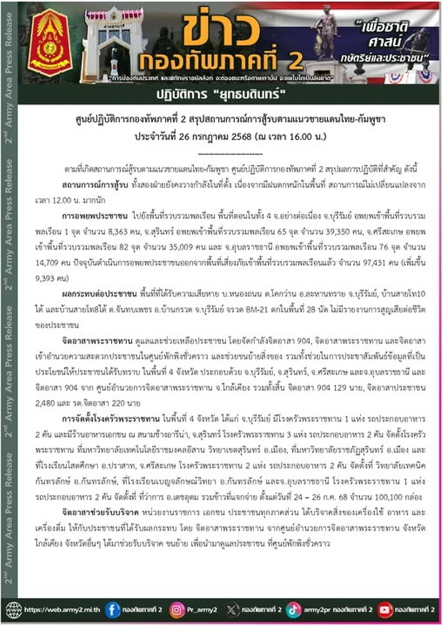 เมื่อวันที่ 26 กรกฎาคม 2568 ศปก.ทภ.2 สรุปสถานการณ์การสู้รบตามแนวชายแดนไทย-กัมพูชา ประจำวันที่ 26 กรกฎาคม 2568 (ณ เวลา 16.00 น.)