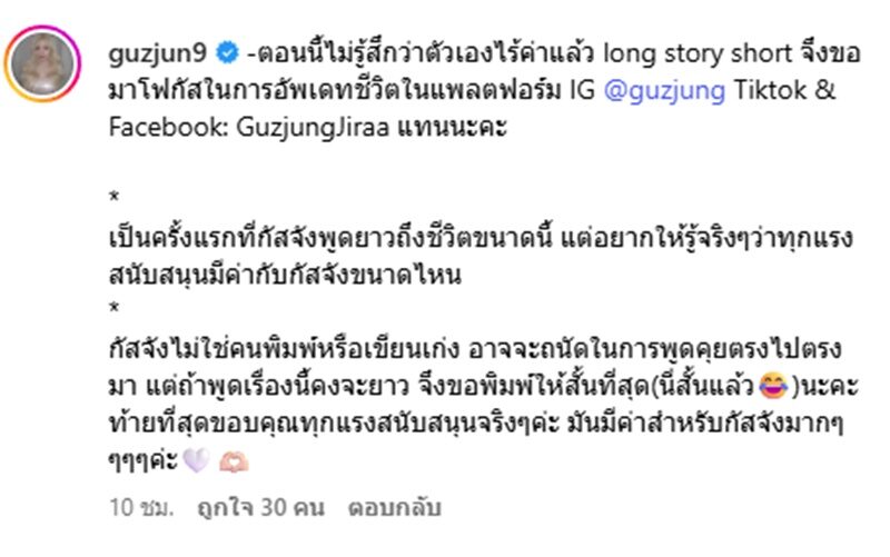“-ตอนนี้ไม่รู้สึกว่าตัวเองไร้ค่าแล้ว long story short จึงขอมาโฟกัสในการอัพเดทชีวิตในแพลตฟอร์ม IG @guzjung Tiktok & Facebook: GuzjungJiraa แทนนะคะ”