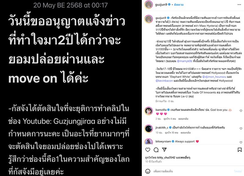 “วันนี้ขออนุญาตแจ้งข่าวที่ทำใจมา 2 ปีได้ กว่าจะยอมปล่อยผ่านและ move on ได้ค่ะ กัสจังได้ตัดสินใจที่จะยุติการทำคลิปในช่อง Youtube : Guzjungjiraa อย่างไม่มีกำหนดการนะคะ เป็นอะไรที่ยากมากๆที่จะตัดสินใจยอมปล่อยช่องไปได้ เพราะรู้สึกว่าช่องนี้คือ1 ในความสำคัญของโลกที่กัสจังมีอยู่เลยค่ะ”