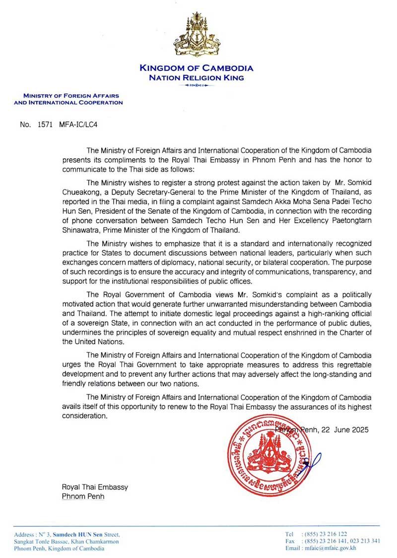 โดยในเอกสารที่ฝ่ายกัมพูชายื่นประท้วง มีใจความโดยสรุปคือ กระทรวงฯ ขอแสดงการประท้วงอย่างรุนแรงต่อการกระทำของนายสมคิด เชื้อคง รองเลขาธิการนายกรัฐมนตรีของไทย ตามที่สื่อไทยรายงานว่าได้ยื่นฟ้อง สมเด็จอัครมหาเสนาบดีเดโช ฮุนเซน ประธานวุฒิสภากัมพูชา โดยเกี่ยวข้องกับการบันทึกเสียงสนทนาทางโทรศัพท์ระหว่างสมเด็จฮุน เซน กับ น.ส.แพทองธาร ชินวัตร นายกรัฐมนตรีไทย
