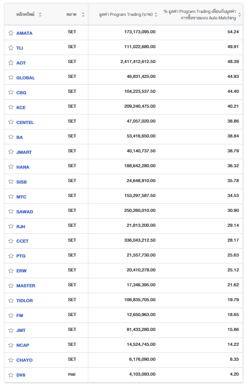 นอกจากนี้ ตลท.ยังรายงานข้อมูลหลักทรัพย์ที่ใช้ Program Trading ซื้อขายสูงสุด 24 อันดับ โดยเรียงจากเปอร์เซ็นต์ (%) มูลค่า Program Trading เทียบกับมูลค่าการซื้อขายแบบ Auto Matching ดังนี้