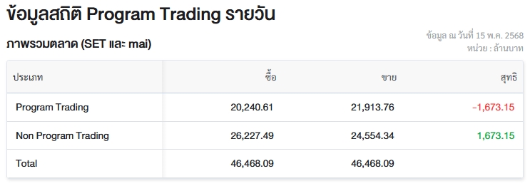 ขณะที่มูลค่าซื้อขายรายวันผ่าน Non Program Trading หรือ “การซื้อขายที่ไม่ใช่โปรแกรม” มีมูลค่าซื้อจำนวน 26,227.49 ล้านบาท และมูลค่าขายจำนวน 24,554.34 ล้านบาท เท่ากับซื้อสุทธิ 1,673.15 ล้านบาท