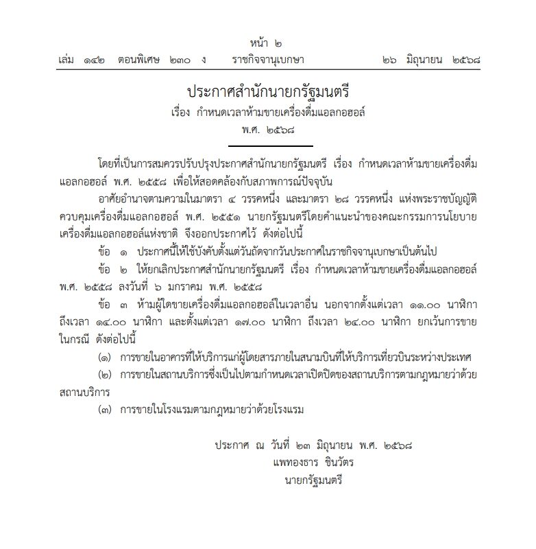 วันที่ 27 มิ.ย.2568 ผู้สื่อข่าวรายงานว่า เว็บไซต์ ราชกิจจานุเบกษา เผยแพร่ประกาศสำนักนายกรัฐมนตรี เรื่องกำหนดเวลาห้ามขายเครื่องดื่มแอลกอฮอล์ พ.ศ. 2568 ลงนามโดย น.ส.แพทองธาร ชินวัตร นายกรัฐมนตรี