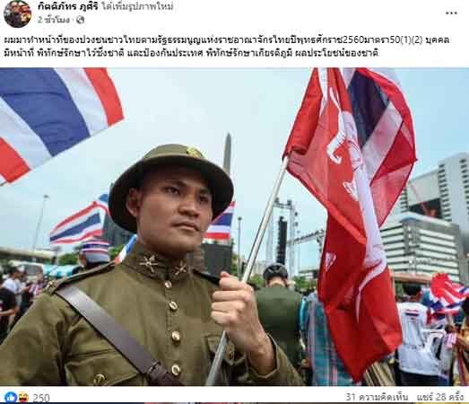ทั้งนี้ กิตติภัทร ยังได้โพสต์ลงเฟซบุ๊กนะบุว่า ตนเองมาทำหน้าที่ปวงชนชาวไทยตามรัฐธรรมนูญ 2560 มาตรา 50 - บุคคลมีหน้าที่พิทักษ์รักษาไว้ซึ่งชาติและป้องกันประเทศ รักษาเกียรติภูมิ ผลประโยชน์ของชาติ