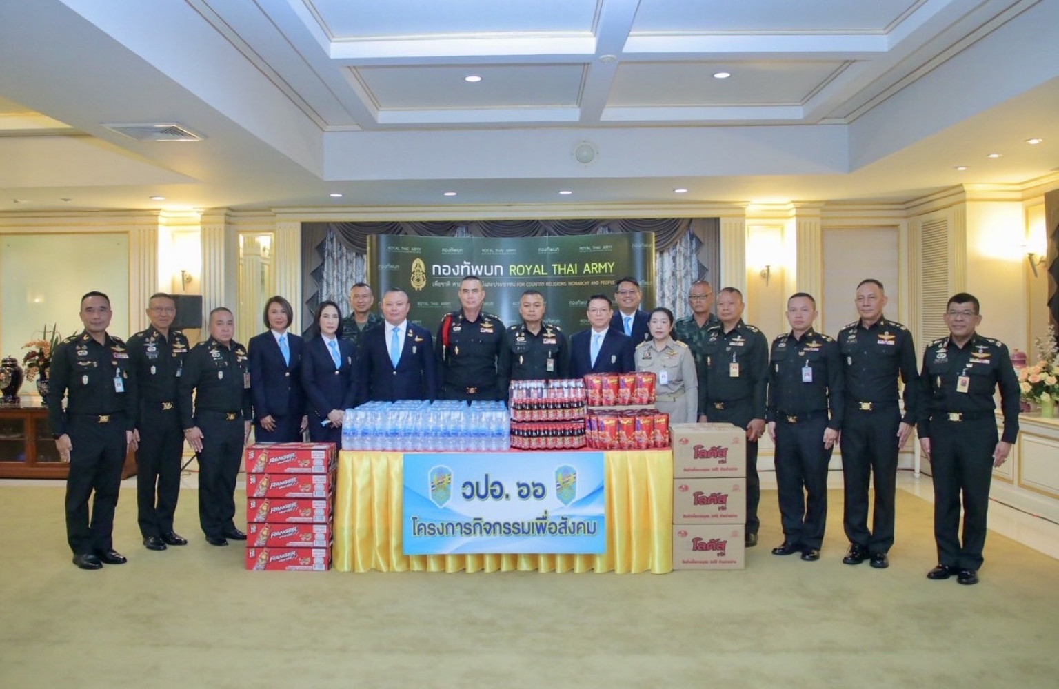 วันที่ 9 มิ.ย.68 เวลา 14.30 น.ผู้สื่อข่าวรายงาน ว่า ณ ห้องรับรอง 321 กองบัญชาการกองทัพบก คณะนักศึกษาหลักสูตรการป้องกันราชอาณาจักร รุ่นที่ 66 (วปอ.รุ่นที่ 66) นำโดย คุณโสภณ ราชรักษา รองกรรมการผู้อำนวยการใหญ่ บริษัท ไทยเบฟเวอเรจ จำกัด (มหาชน) และคุณปิยะธิดา ประดิษฐบาทุกา พร้อมคณะ รวมพลังส่งมอบกำลังใจให้กับทหารแนวหน้าของกองทัพบก โดยได้มอบเงิน สิ่งของและเครื่องดื่ม รวมมูลค่ากว่า 1,000,000 บาท ให้กับกองกำลังป้องกันชายแดนกองทัพบก ที่ปฏิบัติหน้าที่บริเวณชายแดนไทย - กัมพูชา โดยมี พล.ท.บุญสิน พาดกลาง แม่ทัพภาคที่ 2 พร้อมคณะผู้บังคับบัญชาของกองทัพบก เป็นผู้แทนรับมอบ เพื่อเป็นกำลังใจให้กับทหารที่การปฏิบัติหน้าที่ในพื้นที่ชายแดนอย่างเข้มแข็ง