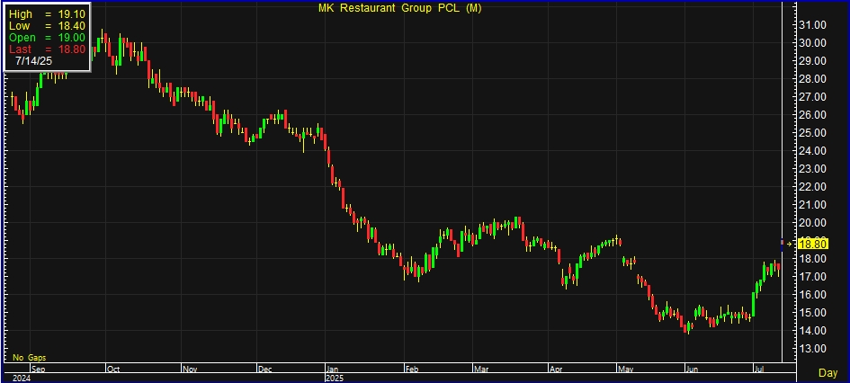 อัพเดต 14 ก.ค. 2568 เวลา 03.08 น. • เผยแพร่ 14 ก.ค. 2568 เวลา 03.08 น. • ข่าวหุ้นธุรกิจออนไลน์ผู้สื่อข่าวรายงานว่า วันนี้ (14 ก.ค.68) ราคาหุ้น บริษัท เอ็มเค เรสโตรองต์ กรุ๊ป จำกัด (มหาชน) หรือ M ณ เวลา 10:03 น. อยู่ที่ระดับ 18.80 บาท บวก 1.40 บาท หรือ 8.05% สูงสุดที่ระดับ 19.10 บาท ต่ำสุดที่ระดับ 18.40 บาท ด้วยมูลค่าการซื้อขาย 51.62 ล้านบาท