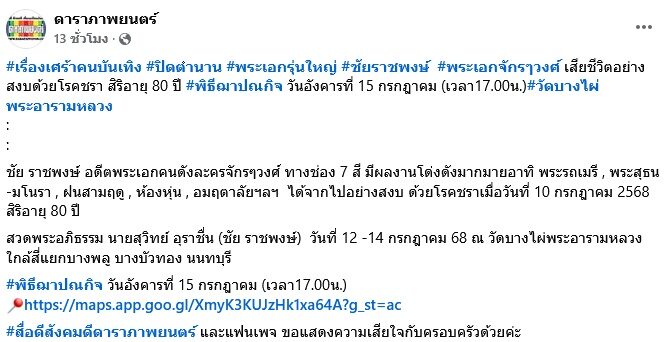 “ชัย ราชพงษ์ อดีตพระเอกคนดังละครจักรๆวงศ์ ทางช่อง 7 สี มีผลงานโด่งดังมากมาย อาทิ พระรถเมรี , พระสุธน-มโนรา , ฝนสามฤดู , ห้องหุ่น , อมฤตาลัยฯลฯ ได้จากไปอย่างสงบ ด้วยโรคชราเมื่อวันที่ 10 กรกฎาคม 2568 สิริอายุ 80 ปี”