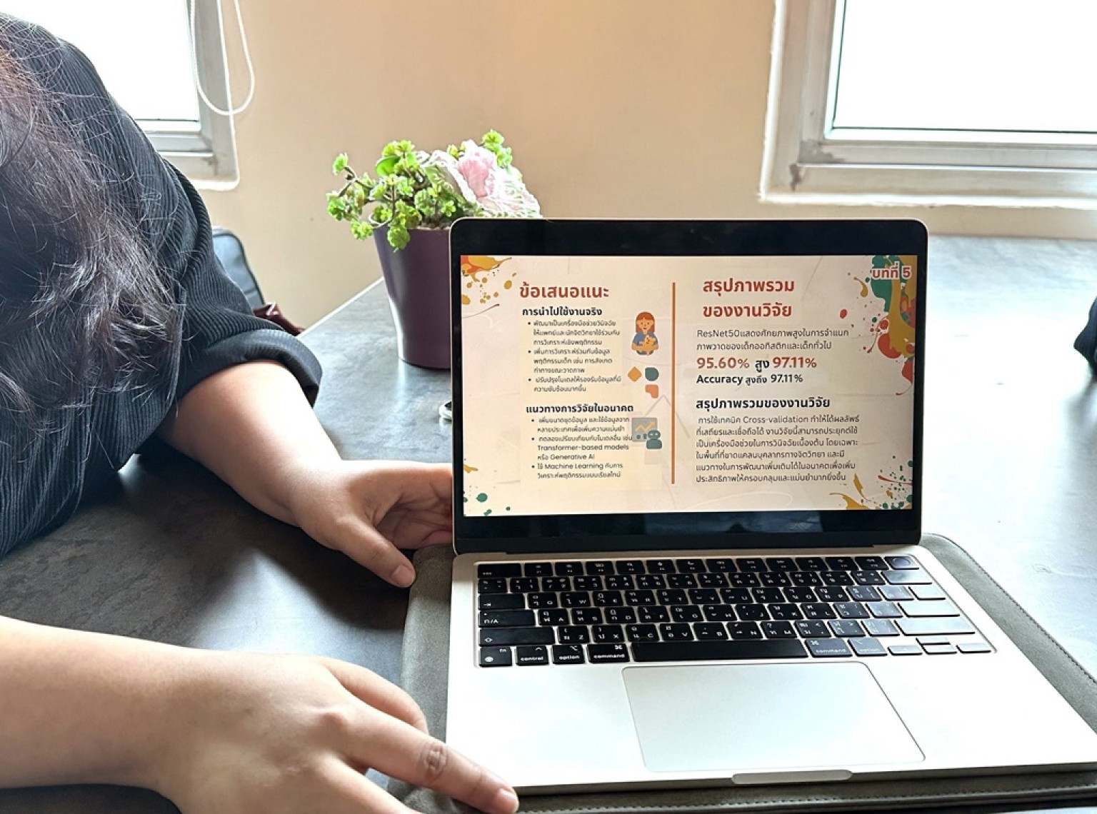 ปกติแล้วเด็ก ๆ จะชอบวาดภาพและระบายสีอยู่แล้ว ดังนั้นงานวิจัยนี้จะสร้างโมเดล AI ที่สามารถวิเคราะห์ภาพวาดที่เด็ก ๆ วาดและระบายสีมาทั้ง 105 ตัวอย่าง โดยทำการสอนให้ AI วิเคราะห์จากทั้งรูปทรง ลายเส้น และชุดการลงสีของภาพวาด ทำให้สามารถแยกแยะภาพวาดของเด็กที่มีแนวโน้มมีภาวะออทิสติก กับภาพวาดของเด็กปกติได้ โดยผลการศึกษามีความถูกต้องมากถึง 92% ซึ่งงานวิจัยสามารถต่อยอดมาพัฒนาเป็นแอปพลิเคชันเพื่อให้ใช้งานได้สะดวกมากขึ้น เป็นประโยชน์สำหรับแพทย์ พ่อแม่ ผู้ปกครอง คุณครู สามารถวินิจฉัยเบื้องต้นได้ เพื่อให้การรักษาดูแลเด็กได้แต่เนิ่น ๆ ต่อไป