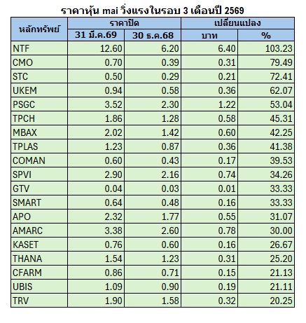 เปิดโผ 19 หุ้น mai วิ่งคึกไตรมาสแรก NTF นำทีมพุ่งเกิน 100%