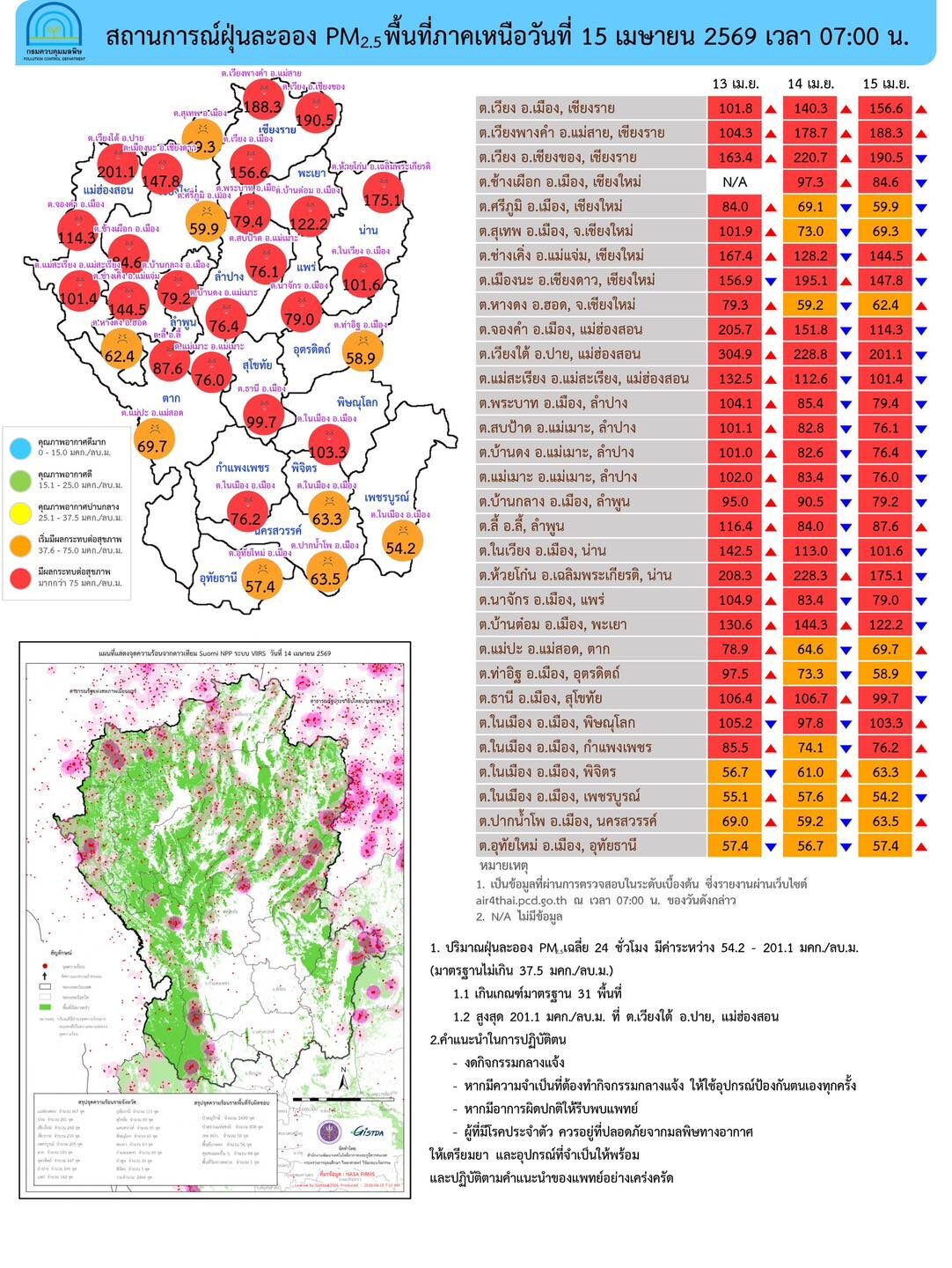 วันที่ 15 เม.ย.2569 ศูนย์สื่อสารการแก้ไขปัญหามลพิษทางอากาศรายงานการติดตามตรวจสอบคุณภาพอากาศ ประจำวันที่ 15 เมษายน 2569 ณ 07:00 น สรุปดังนี้