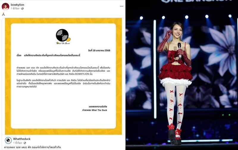 “ค่ายเพลง วอท เดอะ ดัก ขอแจ้งให้ทราบถึงประเด็นข่าวที่ถูกกล่าวถึงบนโลกออนไลน์ในขณะนี้ เพื่อป้องกันไม่ให้เกิดความเข้าใจผิด หรือเผยแพร่ข้อมูลที่ไม่เป็นความจริง อันก่อให้เกิดความเสียหายต่อชื่อเสียง และภาพลักษณ์ของศิลปิน ในกรณีที่มีการพาดพิงถึงบริษัท และ ศิลปิน BOWKYLION นั้น