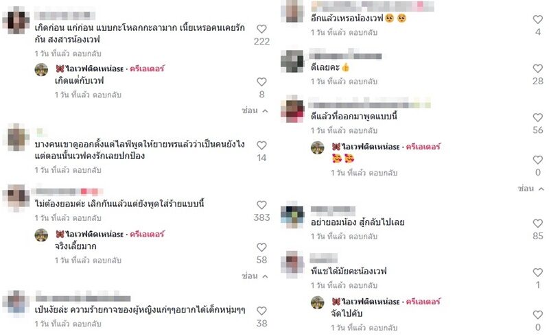 ท่ามกลางคอมเมนต์วิพากษ์วิจารณ์ต่างๆ นานา ว่าหมายถึง พี่เล็ก แฟนเก่าที่ฟินแลนด์เหรอ โดยแฟนๆก็ให้กำลังใจ เวฟ อาทิ เรื่องนี้กูเชื่อเวฟ เพราะที่ผ่านมากูเห็นนางปกป้อง ฟินแลนด์ตลอด , ไม่ต้องยอมค่ะ เลิกกันแล้วแต่ยังพูดใส่ร้ายแบบนี้ เป็นต้น