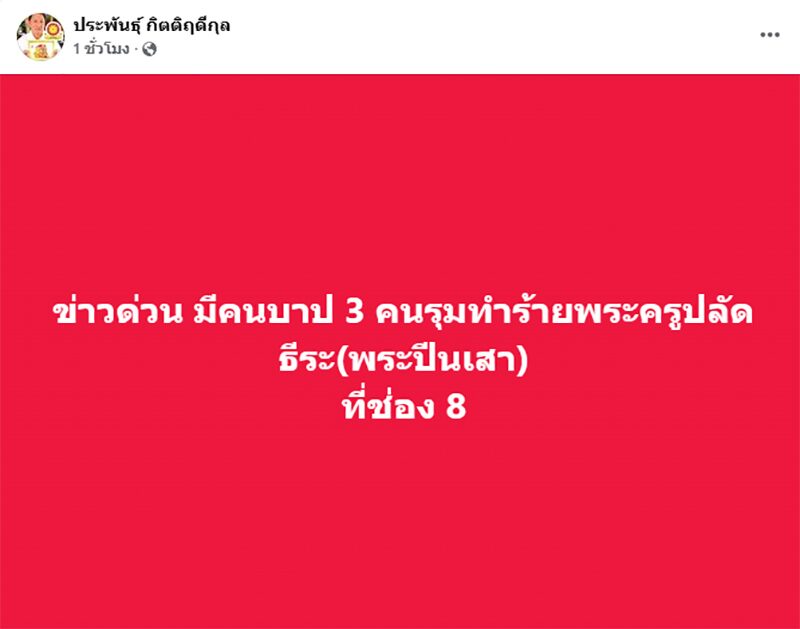จากนั้น นายประพันธุ์ ได้ไลฟ์ผ่านเพจ ปราบ กบฏมุสลิม ระบุว่า เกิดเหตุการณ์รุมทำร้าย พระครูปลัดธีระ ที่ช่อง 8 ขณะกำลังจะกลับ มีการเอาคน 3 คนเป็นผู้ชายไปรุมทำร้าย ตำรวจกำลังพาไปที่เกิดเหตุ เพราะเกรงว่าจะมีการทำลายหลักฐานกล้องวงจรปิด มีกระบวนการทำร้ายพระสงฆ์ ตอนไปช่อง 3 ก็โดนทำร้ายไปแล้ว พฤติกรรมแบบนี้ไม่ใช่คนไทยแล้ว ใช้กำลังทำร้ายพระได้