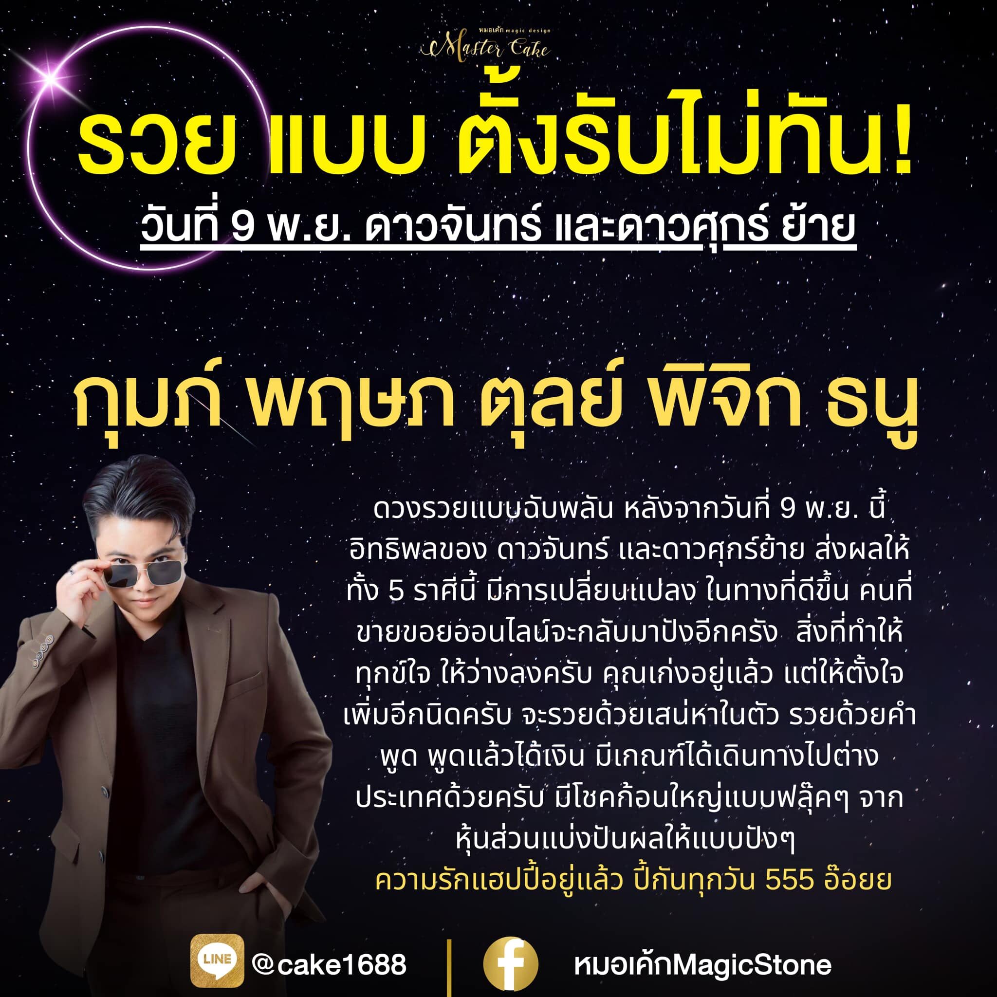 หมอเค้ก Magic stone เปิดดวงชะตา 5 ราศี ดาวจันทร์ ดาวศุกร์ย้าย หลังวันที่ 9 พ.ย. นี้ พร้อมรับการเปลี่ยนแปลงในทางที่ดี จะรวยแบบตั้งรับไม่ทัน! ดวงรวยแบบฉับพลัน หลังจากวันที่ 9 พ.ย.นี้ อิทธิพลของดาวจันทร์และดาวศุกร์ย้าย ส่งผลให้ทั้ง 5 ราศีนี้ มีการเปลี่ยนแปลงในทางที่ดีขึ้น
