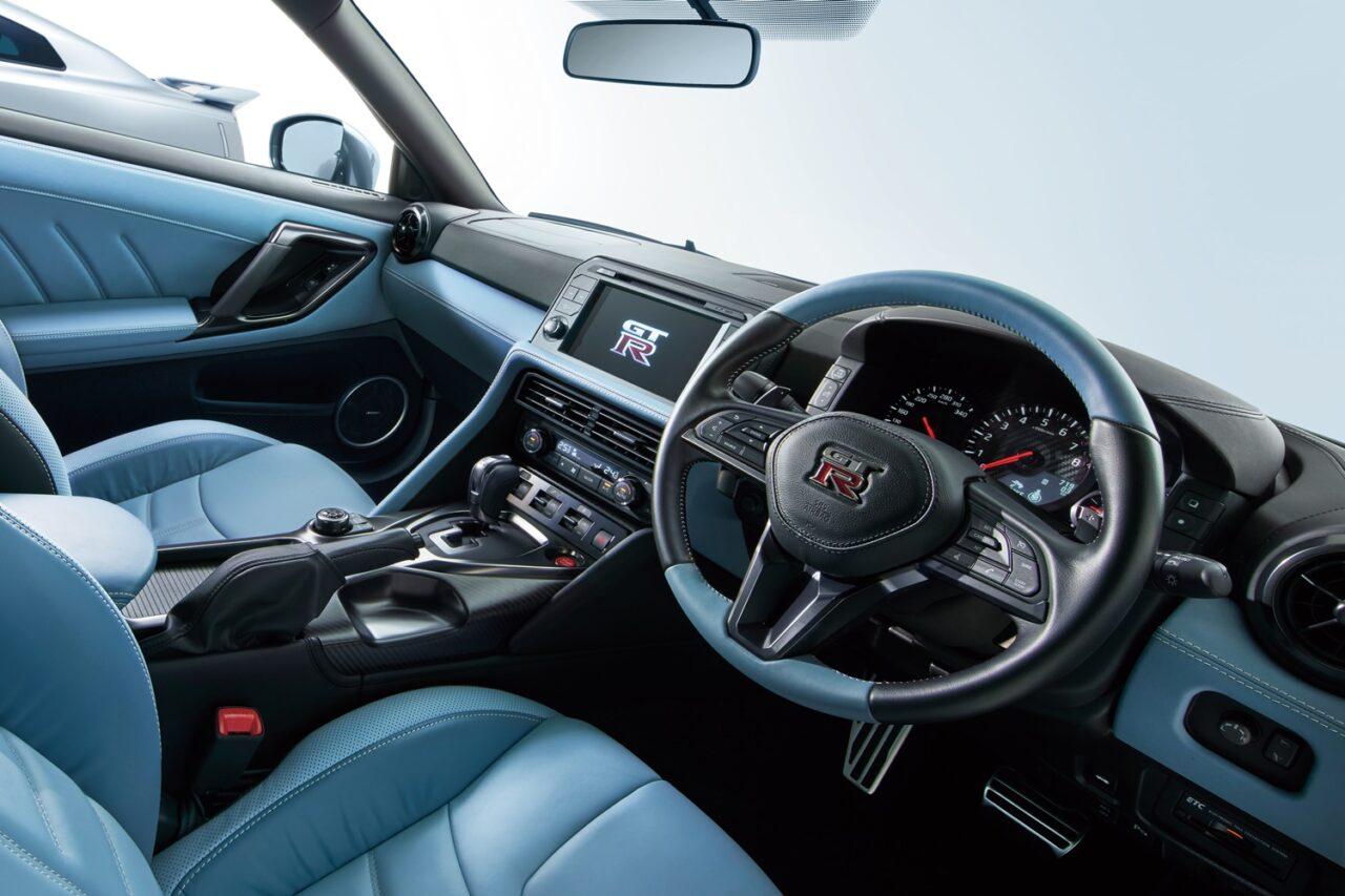 ภายในมาพร้อมโทนสีใหม่ สีน้ำเงินแบบพิเศษจากเดิมมี สีเทา Urban Grey สีแดง Amber Red และ สีดำ Samurai Blackรุ่น GT-R NISMO ได้เบาะนั่งแบบบัคเก็ตซีทตกแต่งลายคาร์บอนใหม่จาก Recaro นอกนั้นคงเดิมตั้งแต่แผงคอนโซลหน้าออกแบบให้เชื่อมต่อกันกับแนวเส้นบนที่ยาวต่อเนื่องจนถึงแผงคอนโซลกลางระบบนำทางในชุดจอสัมผัส 8 นิ้ว แบบ Display Command Console ติดตั้งอยู่ตรงแผงคอนโซลกลาง พร้อมลำโพงคุณภาพ BOSE มากถึง 11 จุด