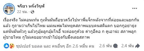 ต่อมา ภรรยาของ แจ็ก แปปโฮ ได้โพสต์ว่า เรื่องจริง ไม่คอนเทนต์ กูเห็นมันถือขวดวิ่งไปหาพี่แจ็กหลังจากที่ต่อยและแยกกันแล้ว กูถามว่าเกินไปไหม แม่งแพ่มไม่หยุดสภาพแบบคนสติแตก บอกกูอย่ายุ่ง แต่นั่นมันผัวกู แล้วกูอุ้มลูกอุ้มโจอี้ จะต่อยกูด้วย ด่ากูอีด… ดูเอานะ สภาพลูกผู้ชายไหม กูไม่เคยอยากเข้าไปยุ่งกับมึงเลยสภาพ