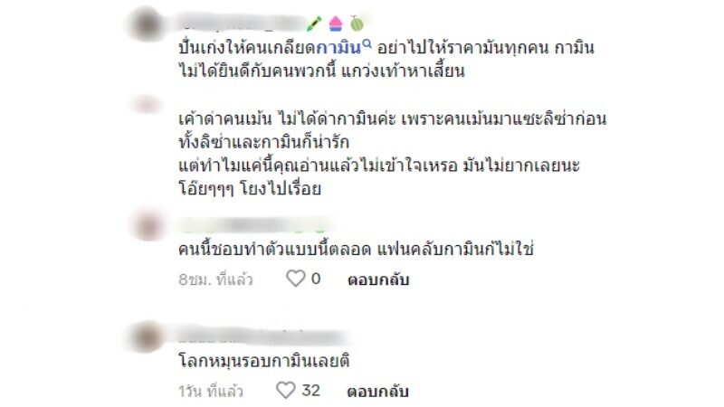รวมไปถึงคอมเมนต์ที่ระบุว่า ลิซ่าจะเป็นกามินให้ได้เลย งานนี้ ไม่มีใครว่ากามินหรือลิซ่า แต่เจ้าของคอมเมนต์โดนจวกยับว่า การคอมเมนต์เช่นนี้มาสร้างความเสียหายให้กับคนที่คุณชื่นชอบเองหรือไม่
