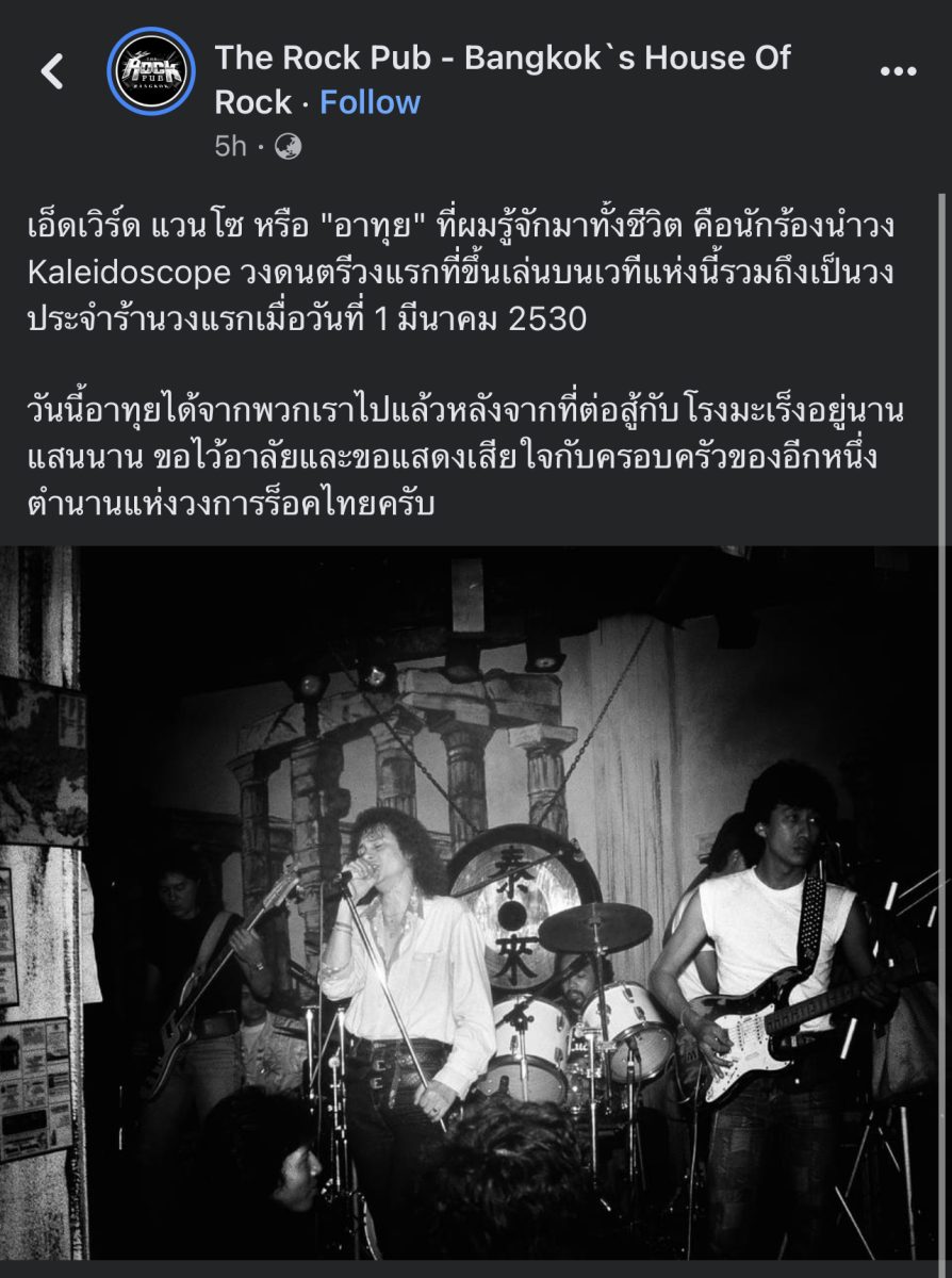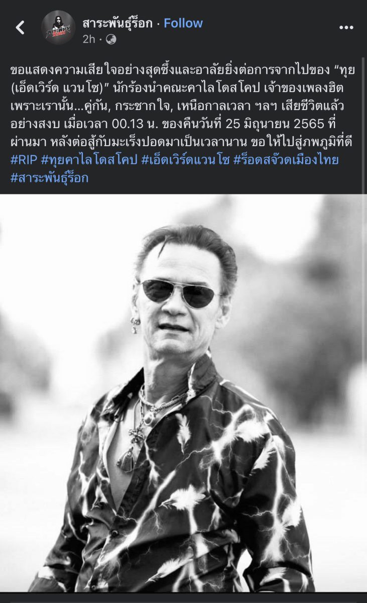 เอ็ดเวิร์ด แวนโซ หรือ “ทุย คาไลโดสโคป” เจ้าของฉายา “ร็อด สจ๊วต เมืองไทย” เสียชีวิตอย่างสงบแล้ว หลังต่อสู้กับโรคมะเร็งปอดมาเป็นเวลานาน