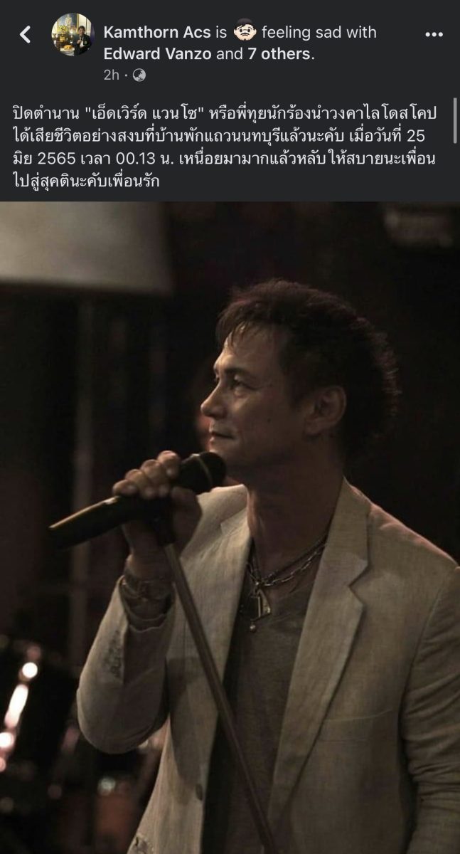 วันนี้ (25 มิถุนายน 2565) เวลา 00.13 น. นายเอ็ดเวิร์ด สินสุข หรือ เอ็ดเวิร์ด แวนโซ (ทุย) นักร้องนำวงคาไลโดสโคป ได้เสียชีวิตลงอย่างสงบ หลังจากต่อสู้และรักษาโรคมะเร็งปอดมาอย่างยาวนาน
