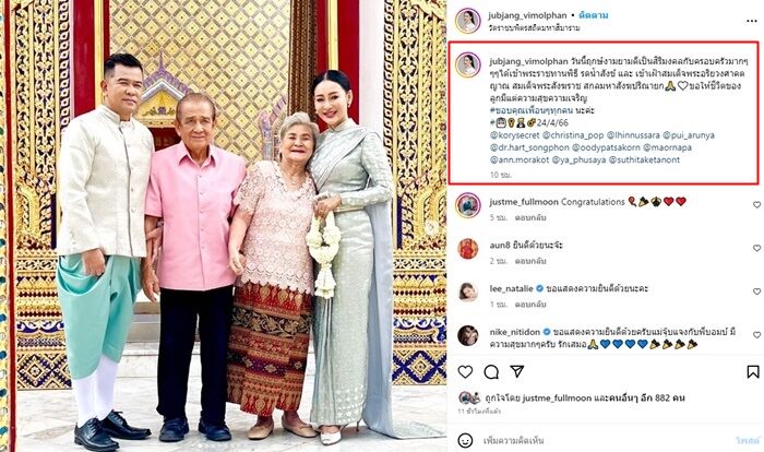 ทั้งนี้ “จุ๊บแจง” เผยถึงวิวาห์หวานครั้งนี้ด้วยพร้อมเผยภาพลงโซเชียล แคปชั่นว่า “ความรักเป็นสิ่งที่สวยงามไม่จำกัดเพศ ไม่จำกัดวัย ไม่มีใครแก่เกินที่จะมีความรัก ช่วงวัยรุ่นเวลามีแฟน เราอยากจะสร้างครอบครัว เติมความฝันไปกับเรา แต่พออายุมากขึ้น ก็ถามตัวเองว่าใครนะที่จะดูแลเราไปจนแก่เฒ่า ยามไม่สบายพาเราไปหาหมอ ใส่ใจเราได้ในทุกๆเรื่อง เราไม่รู้หรอกว่าอนาคตความรักมันจะดีหรือไม่ดี รู้แต่ว่า วันนี้เราทำมันให้ดีที่สุดเท่านั้นก็พอ” ท่ามกลางคนบันเทิงเข้ามาร่วมยินดีจำนวนมาก