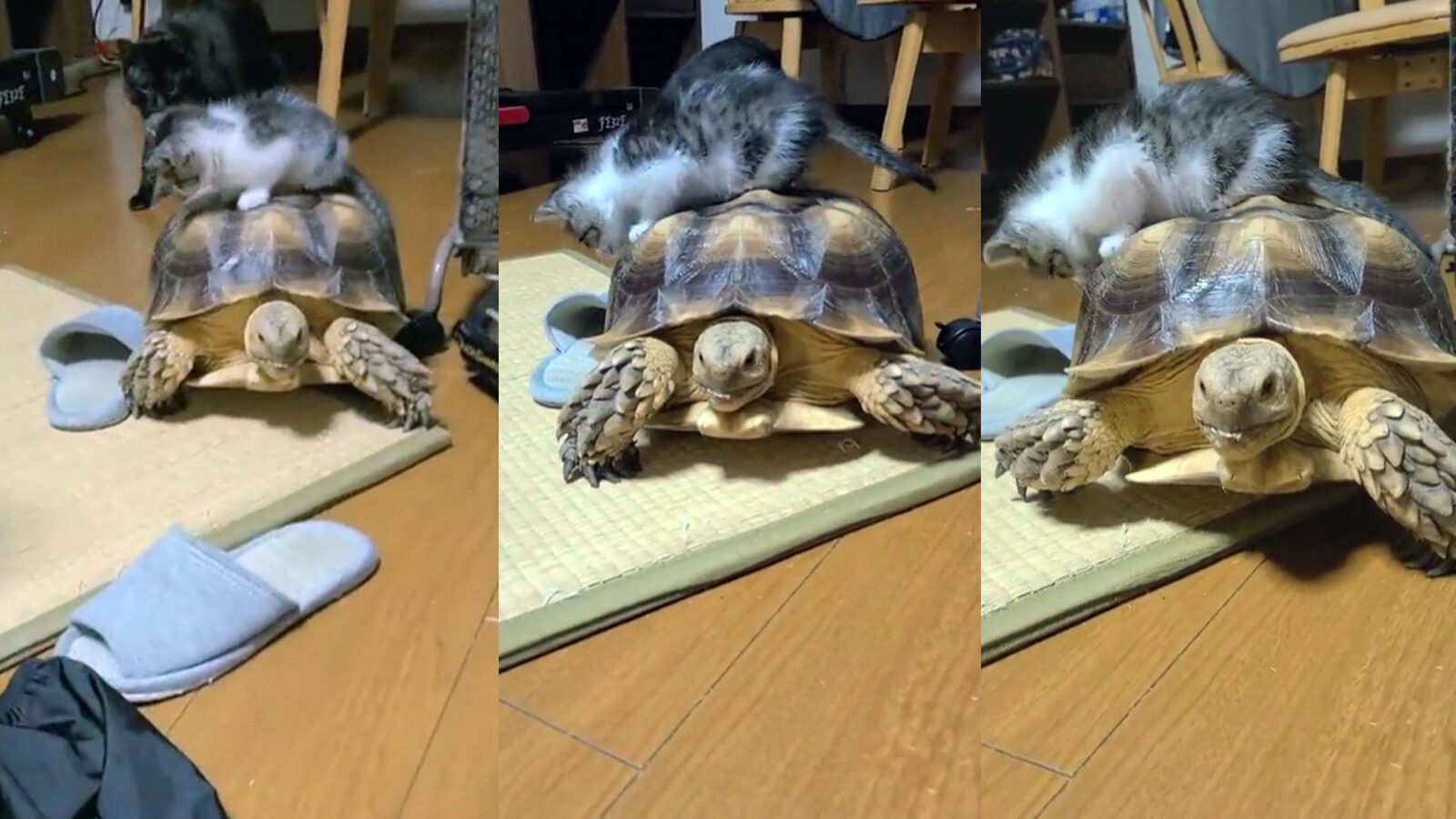 ไวรัลสุดน่ารักจากญี่ปุ่น มิตรภาพสัตว์โลกระหว่างลูกแมวกับเต่า ที่บุคลิกต่างกันสุดขั้ว แต่ยังเป็นเพื่อนกันได้ แถมโดดขี่หลังได้ด้วย!