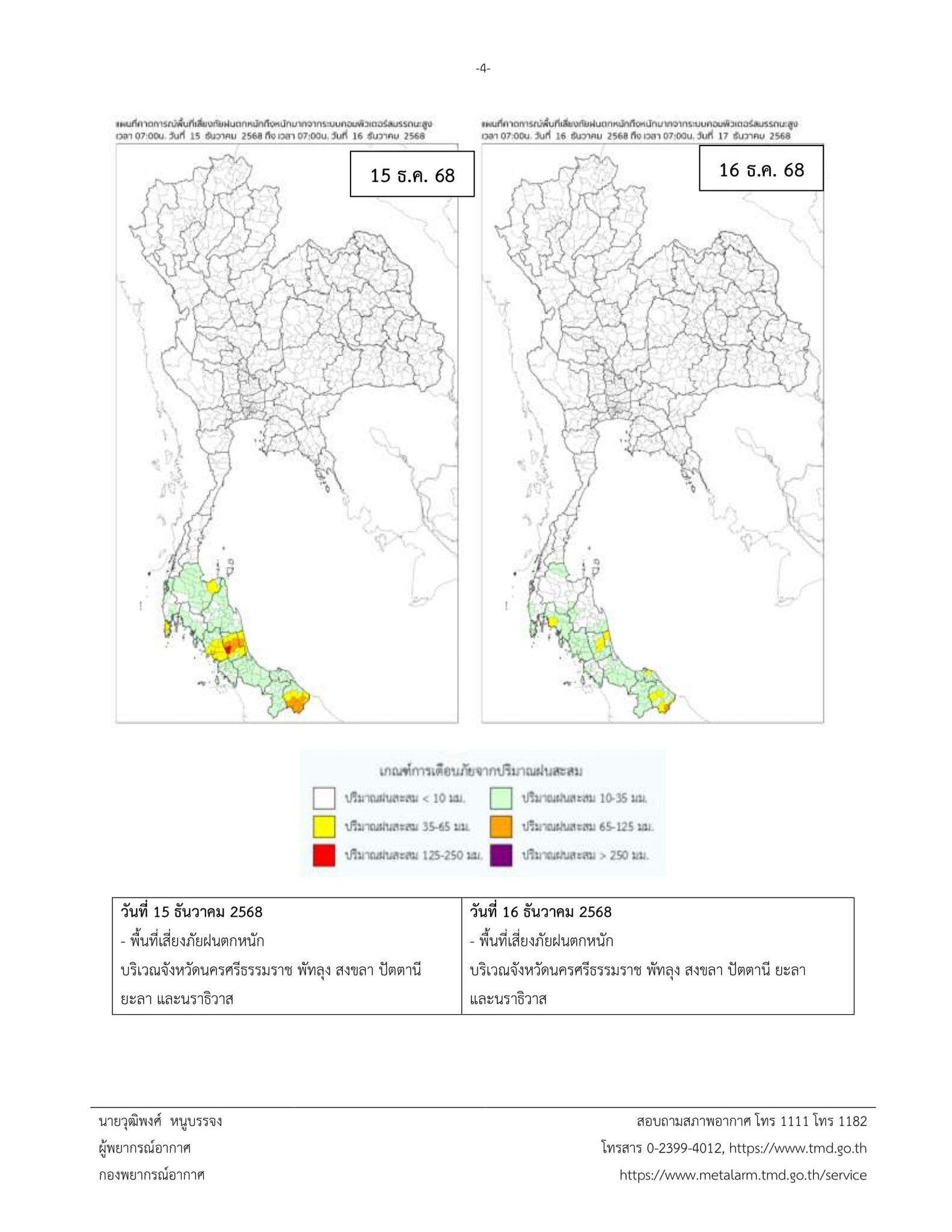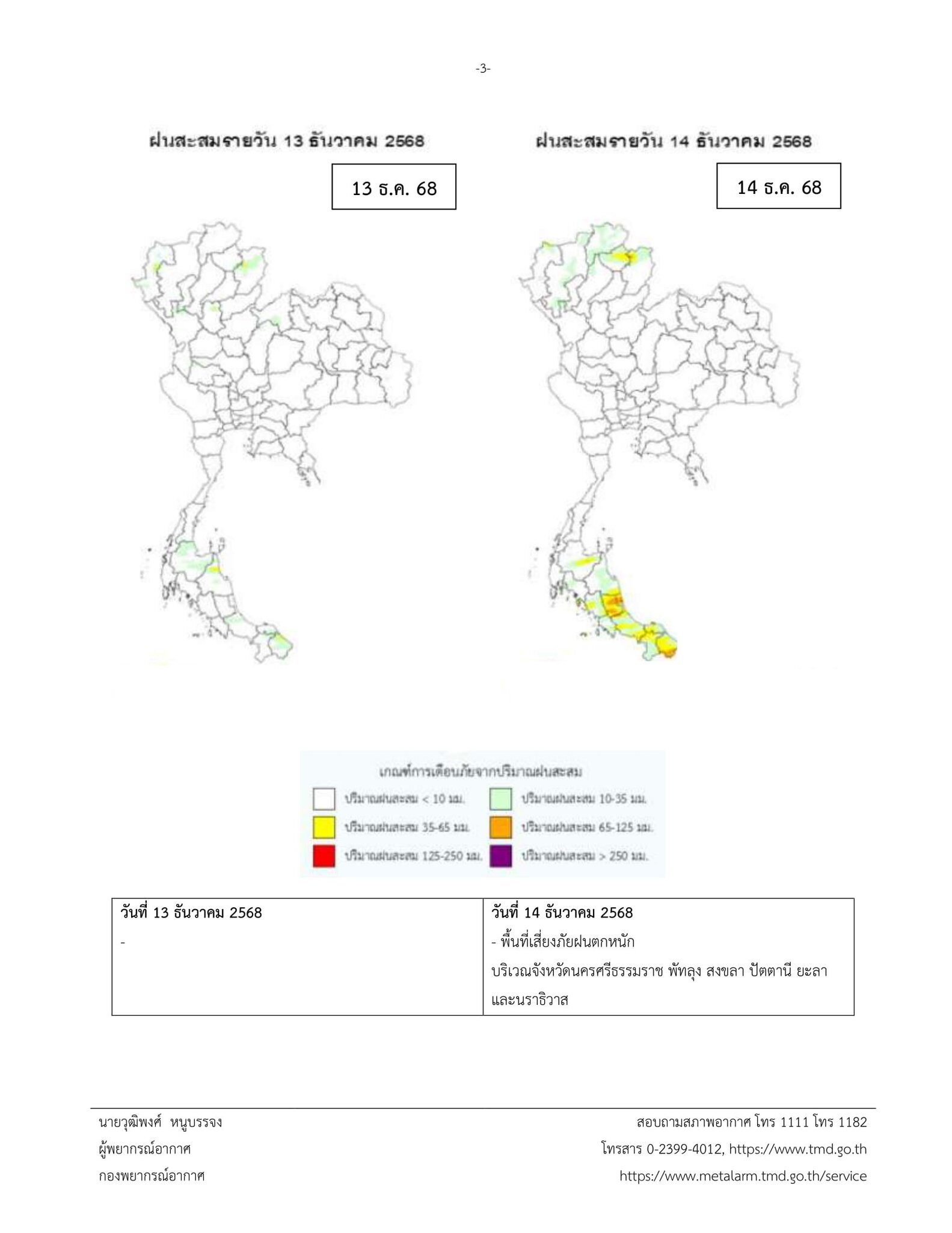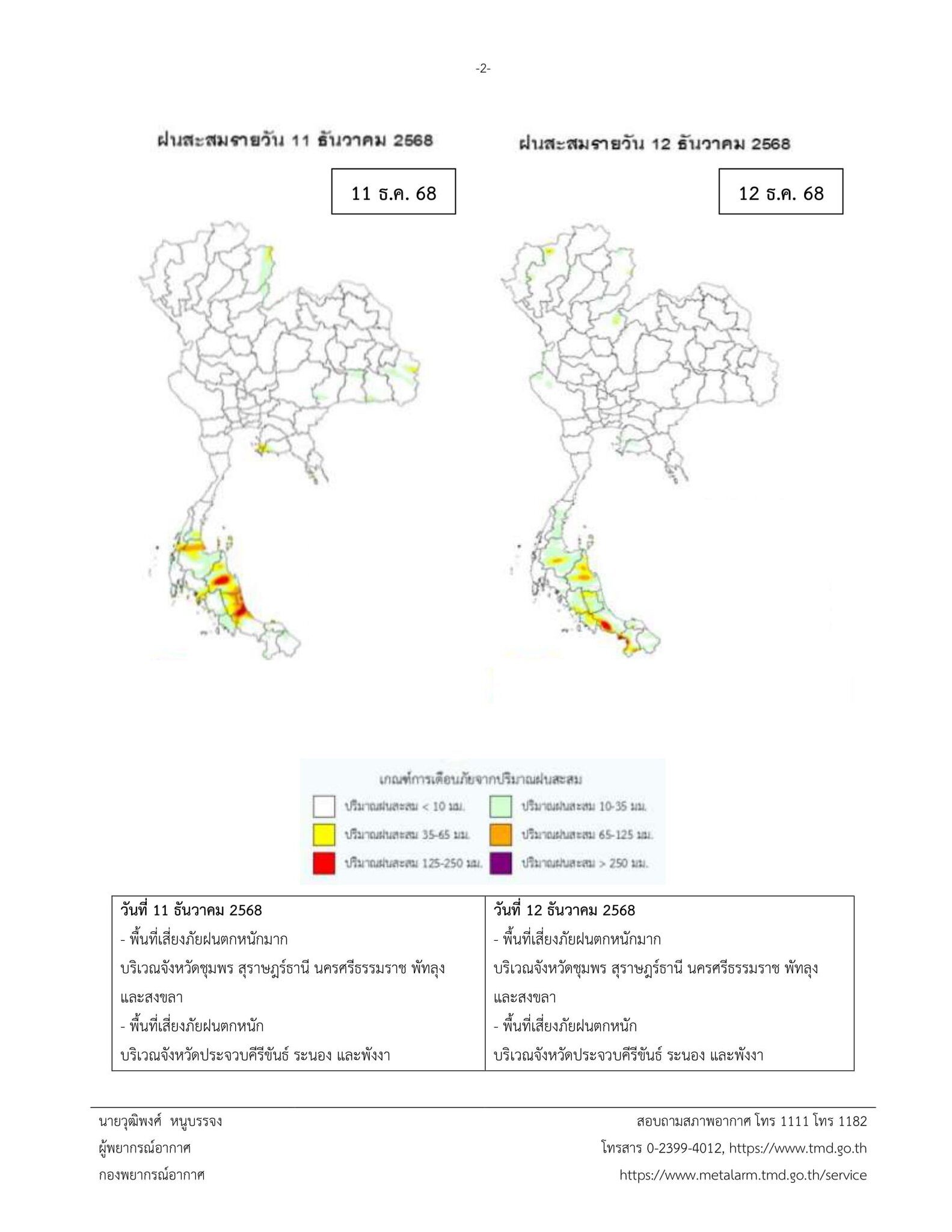 ขณะเดียวกันกรมอุตุนิยมวิทยา ประกาศเตือนฝนตกหนักถึงหนักมากภาคใต้ และคลื่นลมแรงอ่าวไทย (มีผลถึง 16 ธ.ค. 68)