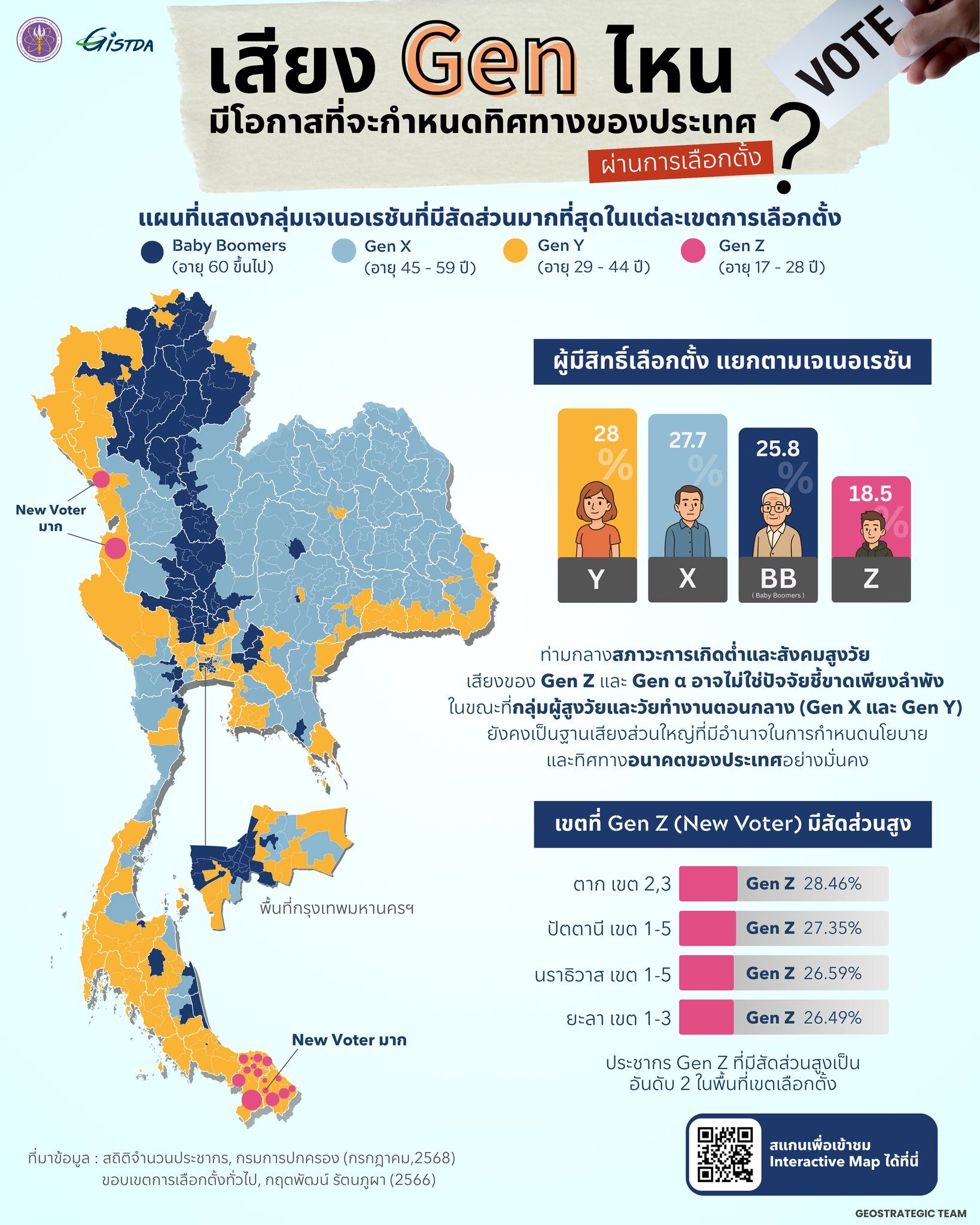 เลือกตั้ง 2569 เปิดข้อมูลการวิเคราะห์เชิงประชากรศาสตร์จาก GISTDA พบ Gen X และ Gen Y เป็นกลุ่มขับเคลื่อนหลัก พร้อมจับตาพื้นที่ 4 จังหวัด นิวโหวตเตอร์มากสุด