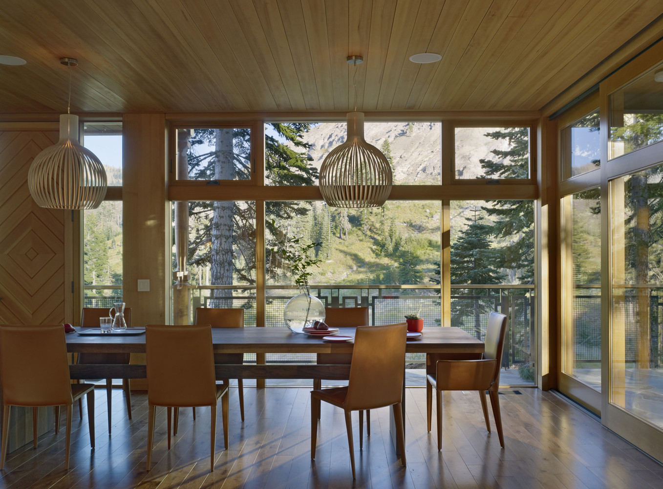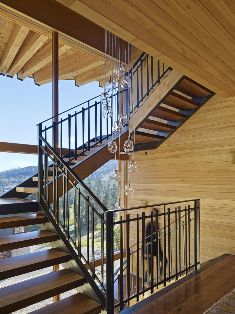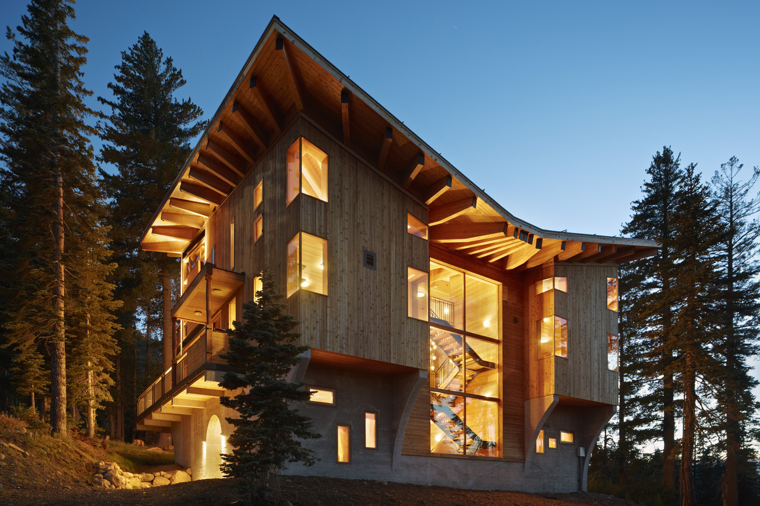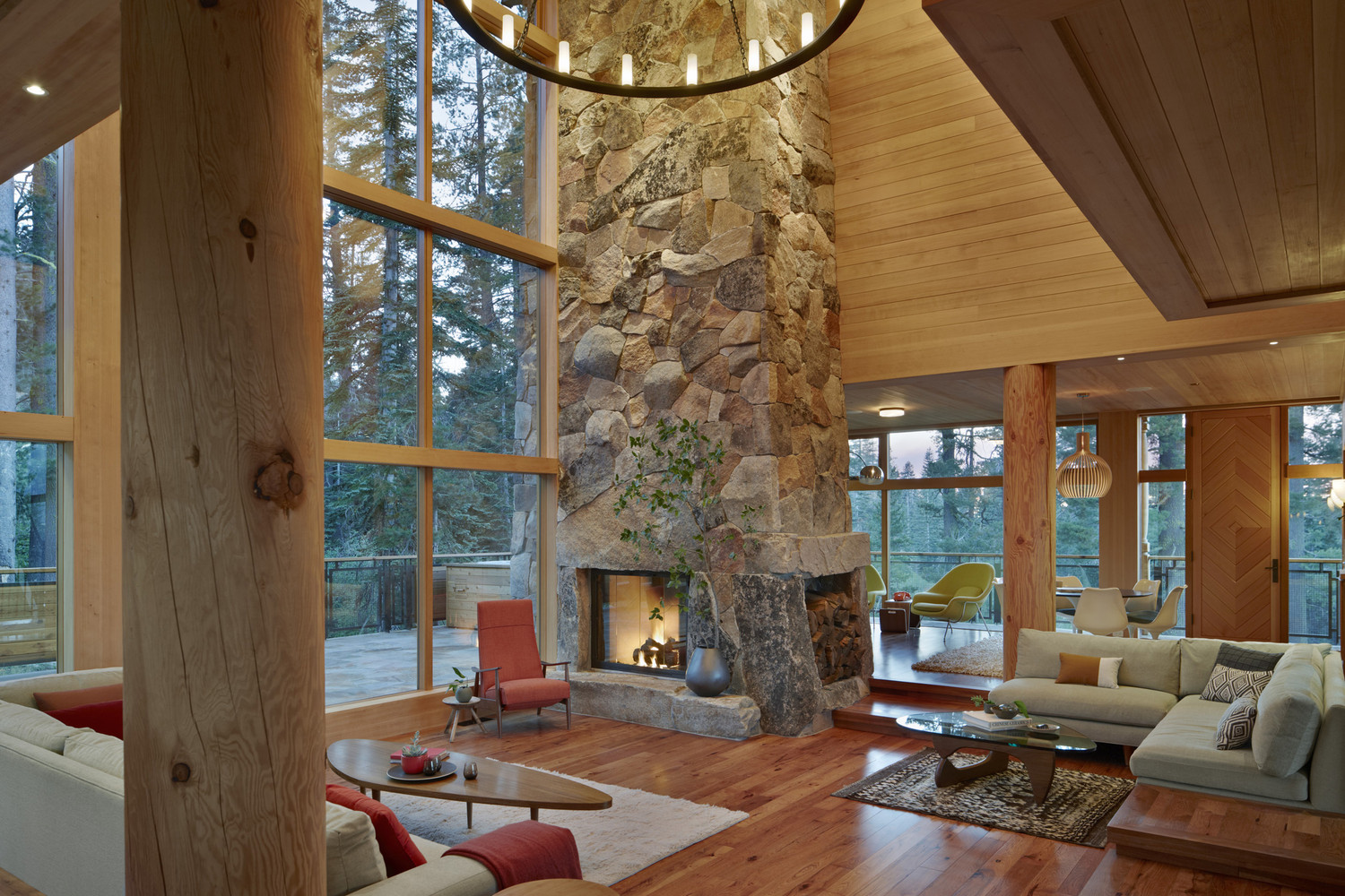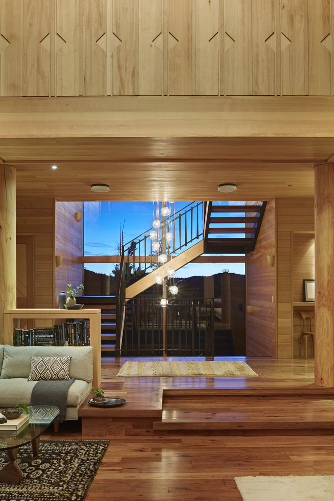 เจ้าของบ้านเลือกตกแต่งด้วยแสงวอร์มไลท์ทั้งหลัง ช่วยในการสร้างบรรยากาศที่อบอุ่นแม้อยู่กลางป่าเขา ติดตั้งหน้าต่างบานใหญ่ที่มาพร้อมวิวภูเขา และได้รับแสงแดดได้ทั่วทุกมุมบ้าน ในส่วนของห้องนั่งเล่นโปร่งโล่งสบายเพราะออกแบบเป็น Double volume ทั้งยังตกแต่งด้วยโคมไฟขนาดใหญ่กลางห้องช่วยส่องแสงสว่างในยามดึกได้ทั่วถึง และมีโซนผิงไฟเป็นมุมเล็กๆ เพิ่มความอบอุ่นในฤดูหนาว ที่สำคัญหลังคาของบ้านหลังนี้ถูกออกแบบมาในรูปทรงปีกผีเสื้อ เพื่อรับน้ำหนักหิมะจำนวนมากที่มีน้ำหนักมากกว่า 400 ปอนด์ต่อตารางฟุตนั่นเอง