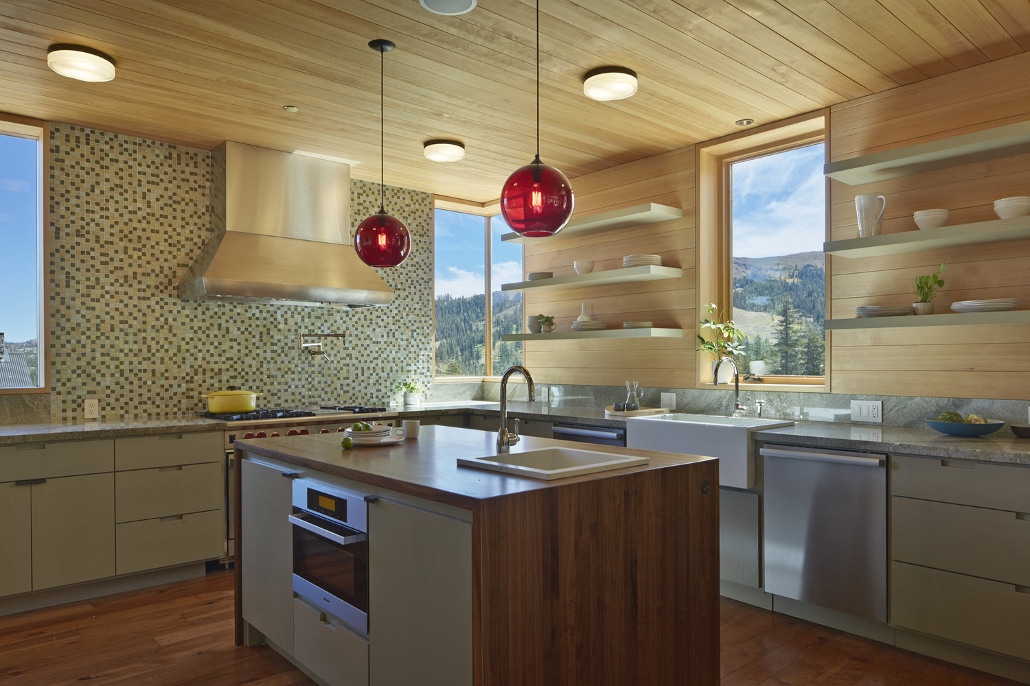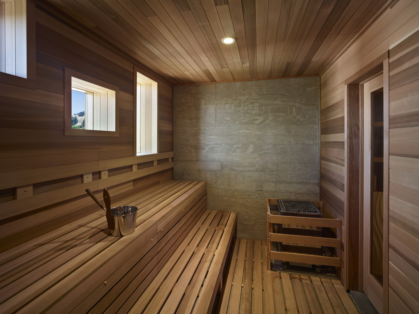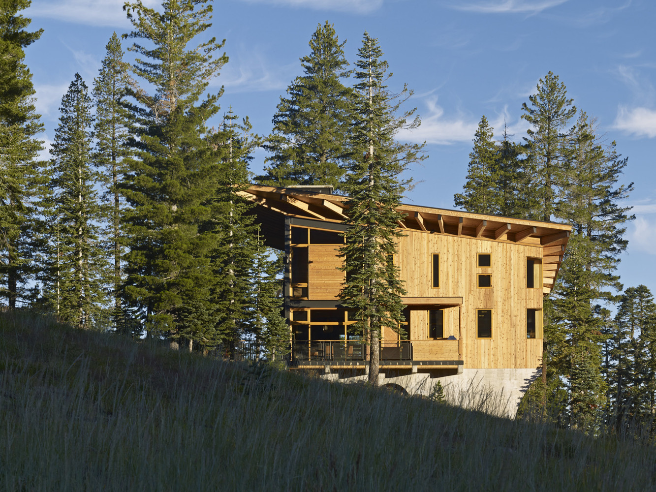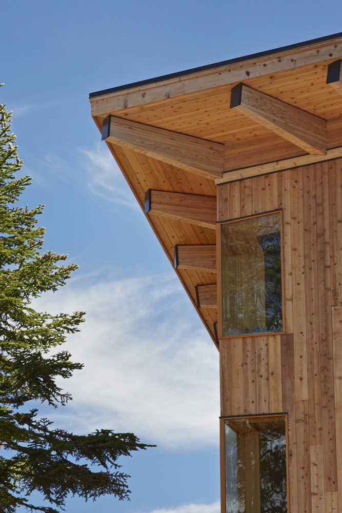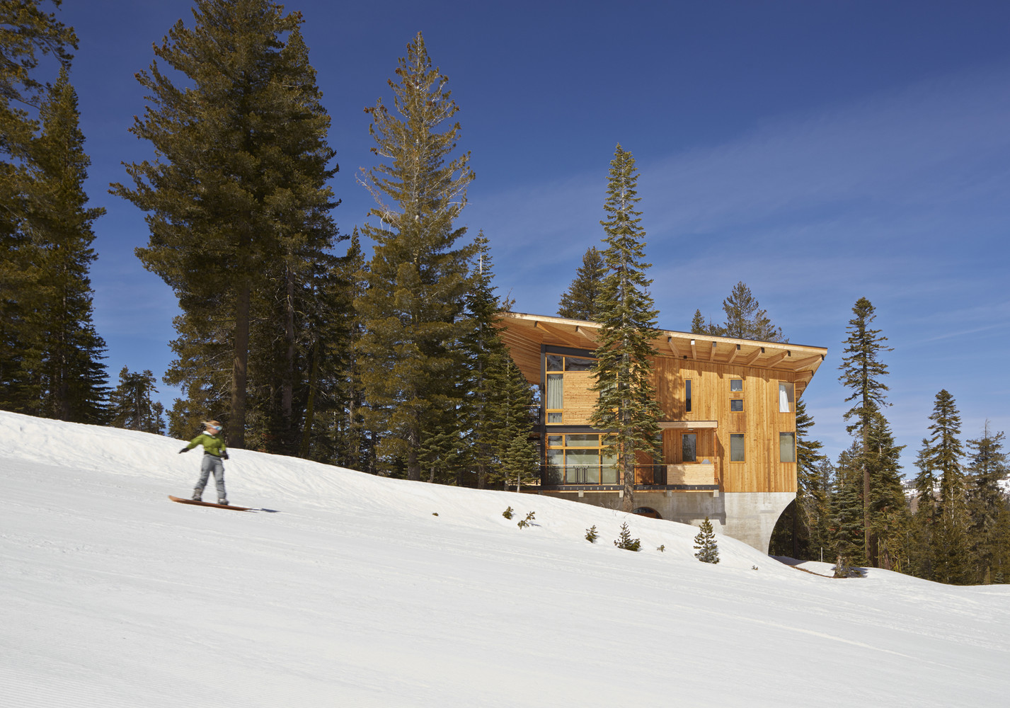 เจ้าของบ้านเลือกตกแต่งด้วยแสงวอร์มไลท์ทั้งหลัง ช่วยในการสร้างบรรยากาศที่อบอุ่นแม้อยู่กลางป่าเขา ติดตั้งหน้าต่างบานใหญ่ที่มาพร้อมวิวภูเขา และได้รับแสงแดดได้ทั่วทุกมุมบ้าน ในส่วนของห้องนั่งเล่นโปร่งโล่งสบายเพราะออกแบบเป็น Double volume ทั้งยังตกแต่งด้วยโคมไฟขนาดใหญ่กลางห้องช่วยส่องแสงสว่างในยามดึกได้ทั่วถึง และมีโซนผิงไฟเป็นมุมเล็กๆ เพิ่มความอบอุ่นในฤดูหนาว ที่สำคัญหลังคาของบ้านหลังนี้ถูกออกแบบมาในรูปทรงปีกผีเสื้อ เพื่อรับน้ำหนักหิมะจำนวนมากที่มีน้ำหนักมากกว่า 400 ปอนด์ต่อตารางฟุตนั่นเอง