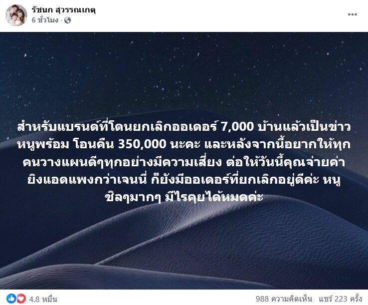 “สำหรับแบรนด์ที่โดนยกเลิกออเดอร์ 7,000 บ้านแล้วเป็นข่าว หนูพร้อม โอนคืน 350,000 นะคะ และหลังจากนี้อยากให้ทุกคนวางแผนดีๆทุกอย่างมีความเสี่ยง ต่อให้วันนี้คุณจ่ายค่ายิงแอดแพงกว่าเจนนี่ ก็ยังมีออเดอร์ที่ยกเลิกอยู่ดีค่ะ หนูชิลๆมากๆ มีไรคุยได้หมดค่ะ”