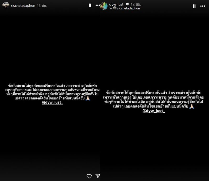 ล่าสุด ฉลามจัส แชร์ข้อความของ สกาย ที่ประกาศตัดสินใจแยกทางกับ ฉลามจัส ลงไอจีสตอรี่ว่า “จัสกับสกายได้คุยกันและปรึกษากันแล้ว ว่าเราจะห่างกันสักพัก เพราะตัวสกายเอง ไม่เคยเจอสภาวะความกดดันขนาดนี้จากสังคม”