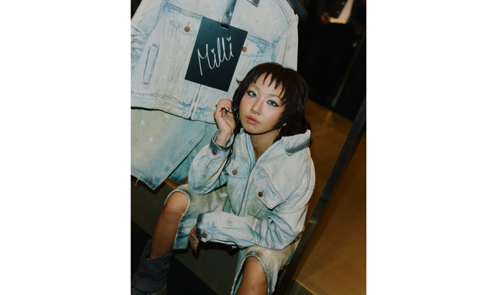 มิลลิ - ดนุภา คณาธีรกุล สะท้อนสไตล์แร็ปเปอร์สุดเท่ออกแบบมาเป็นแจ็คเก็ตเดนิม และกางเกงยีนส์ขาสั้นทรงจอร์ทส์ (Jorts) ที่เน้นเทคนิค Washed & Distressed Effect เล่นกับเฉดสีฟอกซีดอ่อน สเปรย์เพ้นต์ตามขอบปก ขอบเอว และปลายแขนเสื้อ เสริมด้วยเทคนิคสลัดสีและ 3D Crinkle ถ่ายทอดความดิบ เท่ สตรีท และ Self-Expression แบบ Unisex ได้อย่างชัดเจน