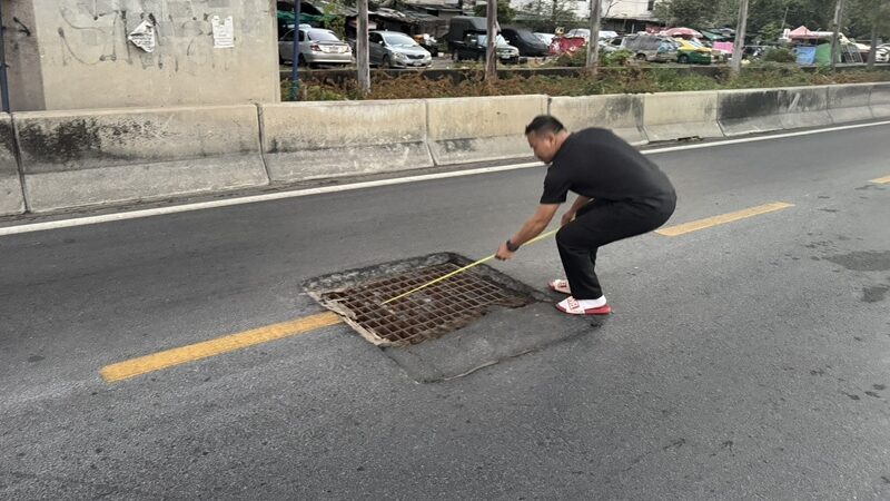 ทั้งนี้ ตนได้ให้คนขับรถของตนไปวัดตัวท่อตรงจุดนั้น งง แล้วจะลาดยางมะตอยไปทำไม ลาดเสร็จห่างประมาณครึ่งฟุต ก็เป็นหลุมฝาท่ออยู่กลางถนน สอบถาม รปภ. แถวนั้นก็ทราบว่า เห็นบ่อย เกิดอุบัติเหตุกับรถจักรยานยนต์ ล่าสุดมีจักรยานยนต์ประสบอุบัติเหตุรถยังจอดอยู่แถวนั้นอยู่เลย ส่วนคนขับขี่ถูกส่งไปโรงพยาบาลอาการสาหัส