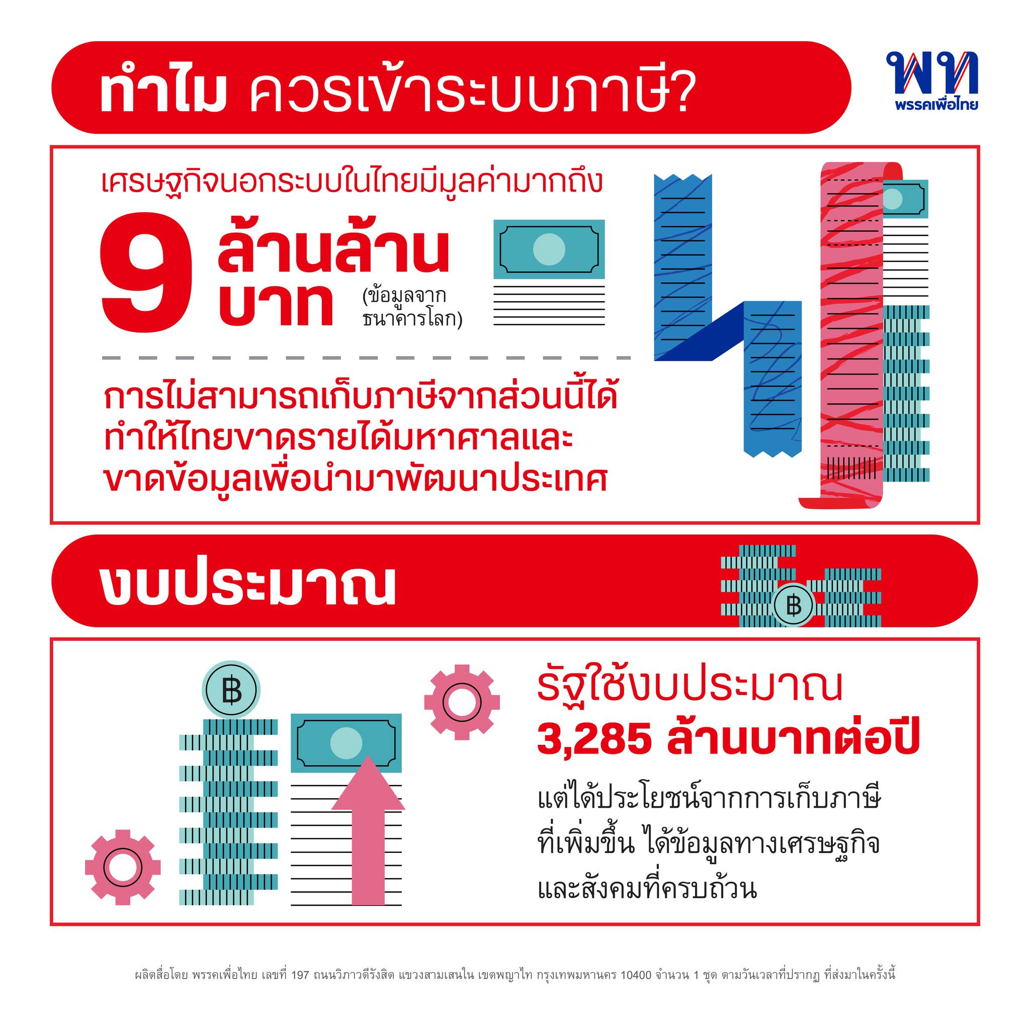 พรรคเพื่อไทย ระบุว่า “เศรษฐกิจนอกระบบในไทยมีมูลค่ามากถึง 9 ล้านล้านบาท (ข้อมูลจากธนาคารโลก) ใหญ่เป็นอันดับ 14 ของโลก และอันดับ 2 ในอาเซียน (รองจากประเทศเมียนมา) การไม่สามารถเก็บภาษีจากส่วนนี้ได้ ทำให้ไทยขาดรายได้มหาศาล ขาดข้อมูลการค้าขายที่แม่นยำ และขาดโอกาสในการพัฒนาประเทศ