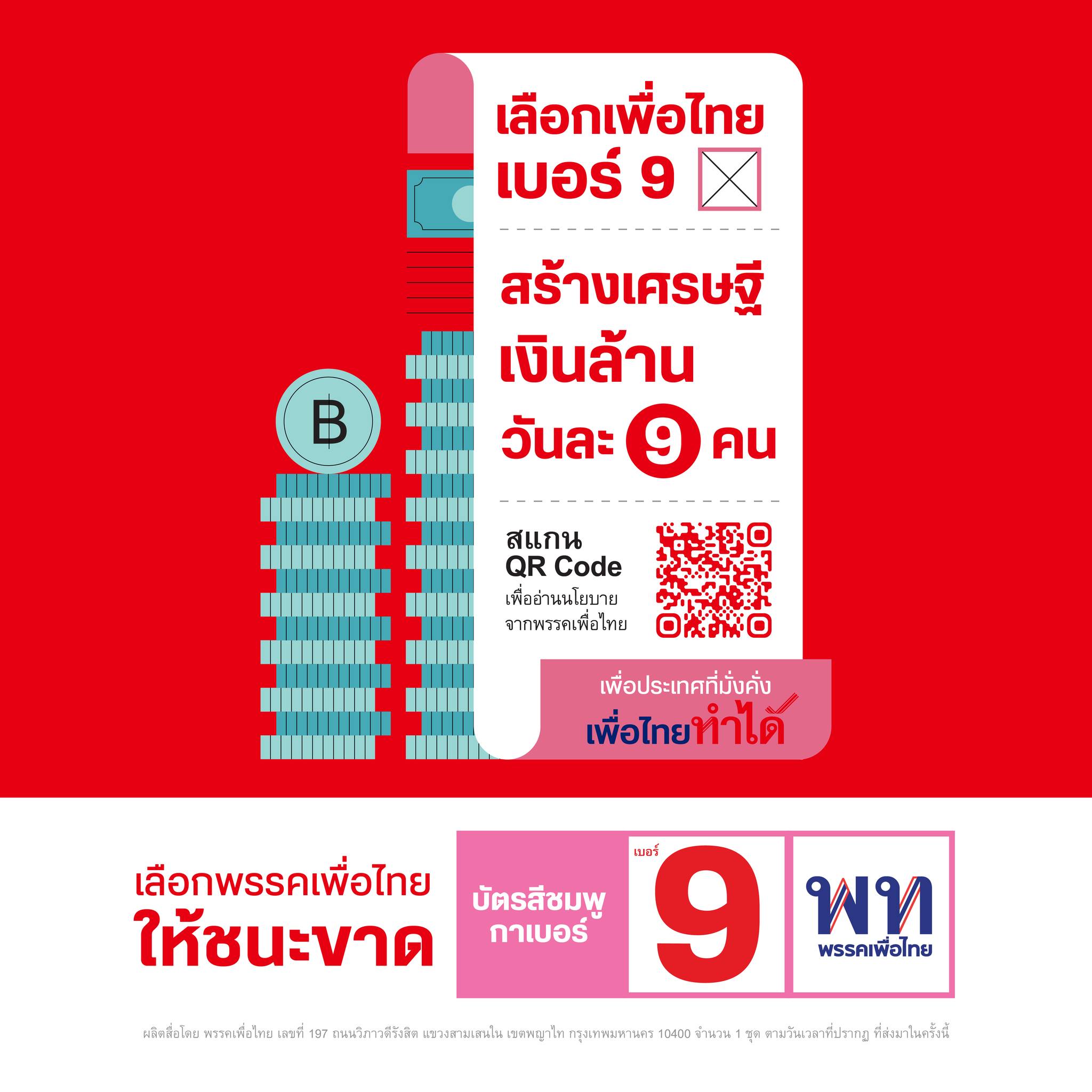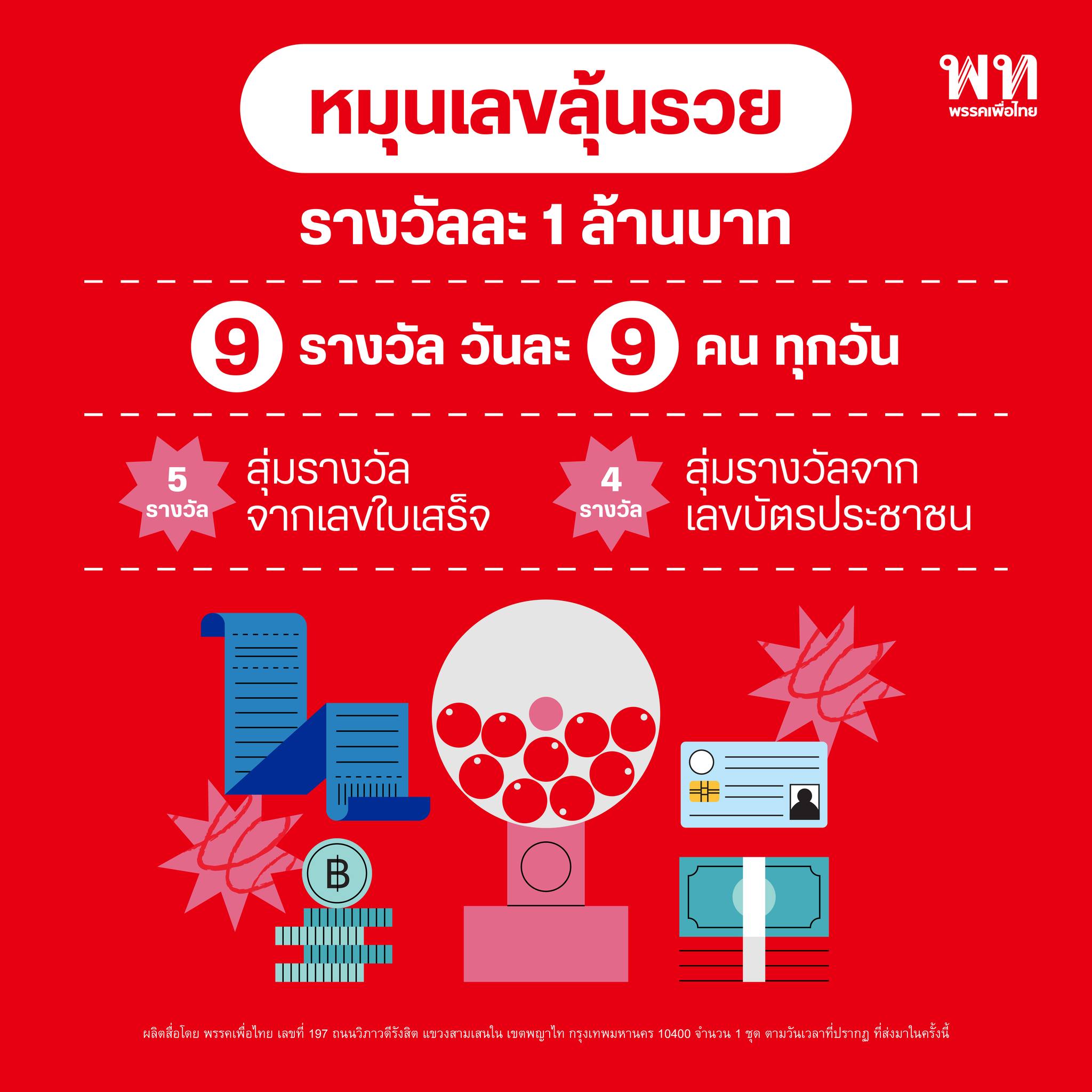 ‘สร้างเศรษฐีเงินล้านวันละ 9 คน‘ ทุกการจับจ่ายคือโอกาสรวยทุกคน ทุกวัน เลือกเพื่อไทย เบอร์ 9 ทั้งคนทั้งพรรค”