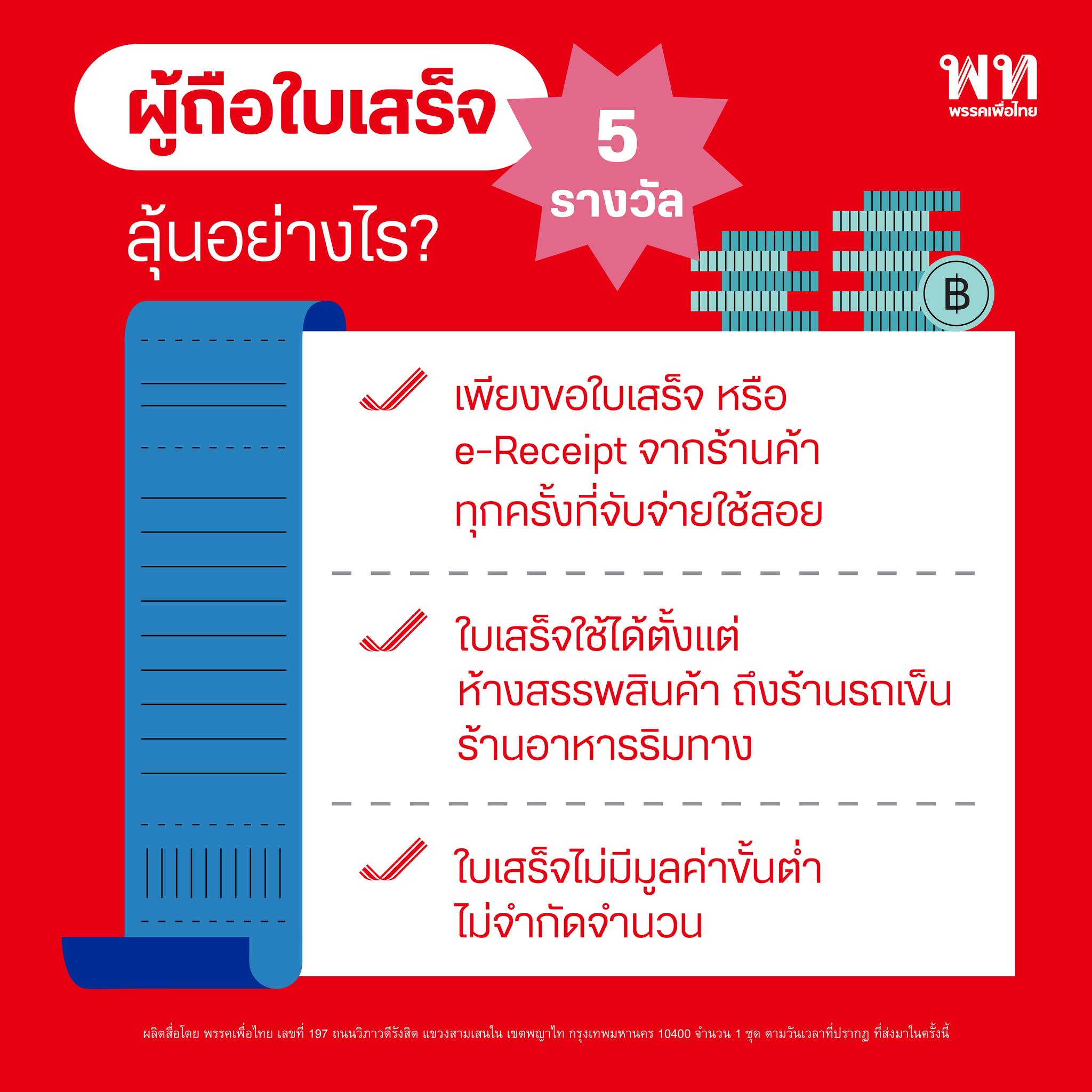 เพียงแค่มีใบเสร็จจากการจับจ่ายใช้สอยทุกประเภทสินค้าและบริการ ใบเสร็จใช้ได้ตั้งแต่ห้างสรรพสินค้าถึงร้านรถเข็น ร้านอาหารริมทาง ไม่มีมูลค่าขั้นต่ำ ไม่จำกัดจำนวนใบเสร็จ เพราะ ‘เพื่อไทย’ มีนโยบาย ’สร้างเศรษฐีเงินล้าน‘ เพื่อสร้างแรงจูงใจให้คนเข้าระบบภาษีแทนการบังคับ ด้วยการสุ่มจับรางวัลจากเลขใบเสร็จ 5 รางวัล รางวัลละ 1 ล้านบาท