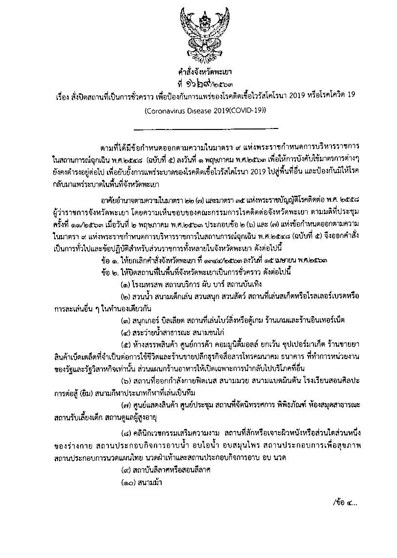1.ให้ยกเลิกคำสั่งจังหวัดพะเยา ที่ 1344/2563 ลงวันที่ 15 เมษายน 2563 2.ให้ปิดสถานที่ในพื้นที่จังหวัดพะเยาเป็นการชั่วคราว ดังต่อไปนี้ 1.โรงมหรสพ สถานบริการ ผับ บาร์ สถานบันเทิง 2.สวนน้ำ สนามเด็กเล่น สวนสนุก สวนสัตว์ สถานที่เล่นสเก็ตหรือโรลเลอร์เบรด หรือการละเล่นอื่นๆ ในทำนองเดียวกัน 3.สนุกเกอร์ บิลเลียด สถานที่เล่นโบว์ลิ่งหรือตู้เกม ร้านเกมและร้านอินเตอร์เน็ต 4.สระว่ายน้ำสาธารณะ สนามชนไก่