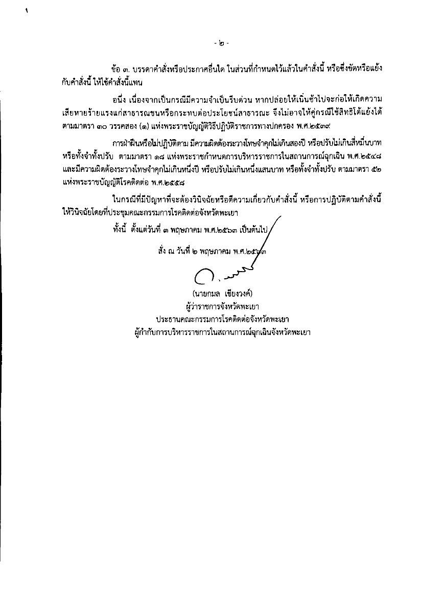 อาศัยอำนาจตามความในมาตรา 22(7) และมาตรา 35 แห่งพระราชบัญญัติ(พ.ร.บ.)โรคติดต่อ พ.ศ.2558 ผู้ว่าราชการจังหวัดพะเยา โดยความเห็นชอบของคณะกรรมการโรคติดต่อจังหวัดพะเยา ตามมติที่ประชุมครั้งที่ 11/2563 เมื่อวันที่ 2 พฤษภาคม 2563 ประกอบข้อ 2(6) และ (7) แห่งข้อกำหนดออกตามความในมาตรา 9 แห่ง พ.ร.ก. บริหารราชการในสถานการณ์ฉุกเฉิน พ.ศ.2548 (ฉบับที่ 5) จึงออกคำสั่งเป็นการทั่วไปและข้อปฏิบัติสำหรับส่วนราปิดชการทั้งหลายในจังหวัดพะเยา ดังต่อไปนี้