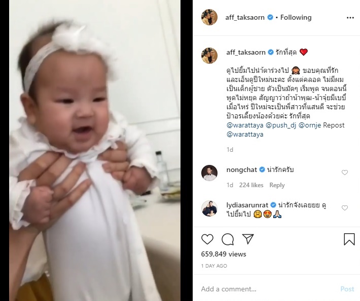 ซึ่ง แอฟ ทักษอร เข้าไปคอมเมนต์ด้วยว่า ดูแล้วจะไม่ให้เสียน้ำตายังไงไหว น่ารักที่สุดเลย ขอบคุณน้าจุ๋ย น้าพุฒ ป้าอร ที่เอ็นดูปีใหม่มาตลอดตั้งแต่เล็ก ปีใหม่เค้ารักของเค้าจริงๆค่ะ