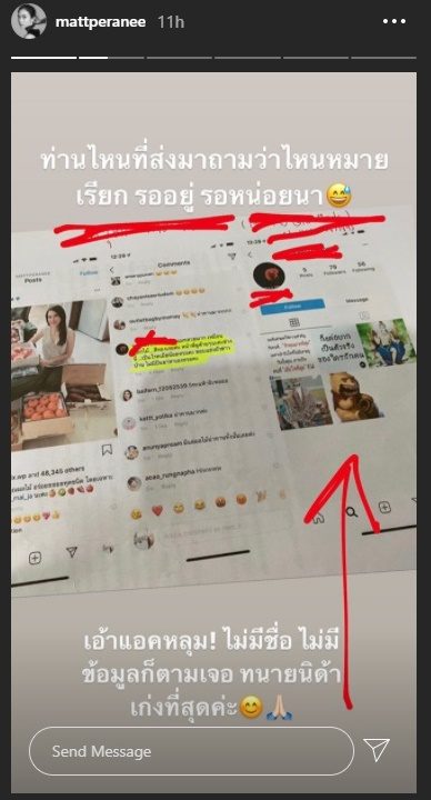 แมท ยังได้โพสต์ถึงเกรียนคีย์บอร์ดที่ยังไม่ยอมจบด้วยยังส่งข้อความมาป่วนอีกว่า “ท่านไหนที่ส่งมาถามว่า ไหนหมายเรียกรออยู่ รอหน่อยนา” พร้อมบอกอีกว่า “เอ้าแอคหลุม! ไม่มีชื่อไม่มีข้อมูลก็ตามเจอ ทนายนิด้าเก่งที่สุดค่ะ”