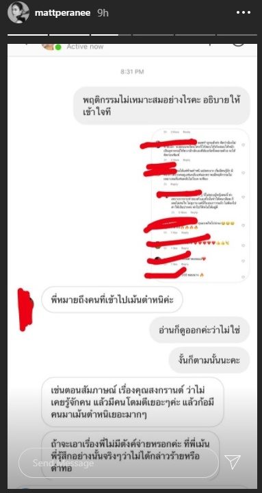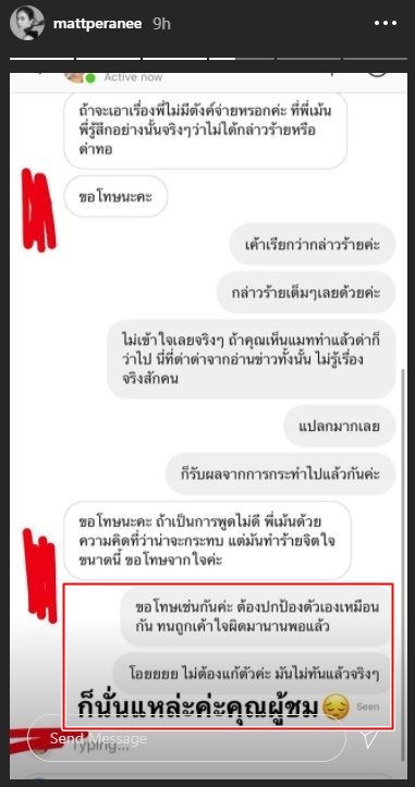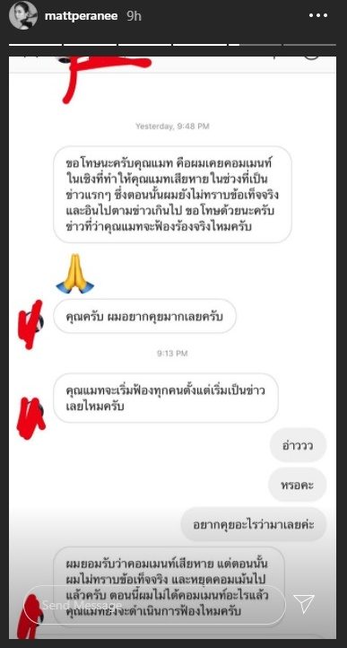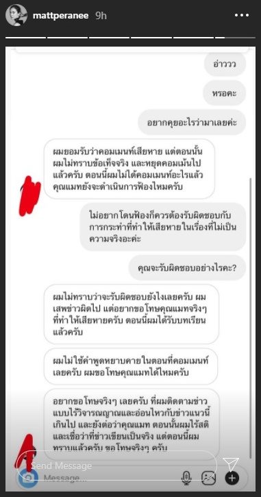 โดย แมท เผยแชทที่ตัวเองได้ตอบคนที่เข้ามามอบตัวด้วย อาทิ “ขอโทษเช่นกันค่ะ ต้องปกป้องตัวเองเหมือนกัน ทนถูกเข้าใจผิดมานานพอแล้ว” , “โอยยยย ไม่ต้องแก้ตัวค่ะ มันไม่ทันแล้วจริงๆ” พร้อมบอกด้วยว่า “ก็นั่นแหละค่ะคุณผู้ชม”