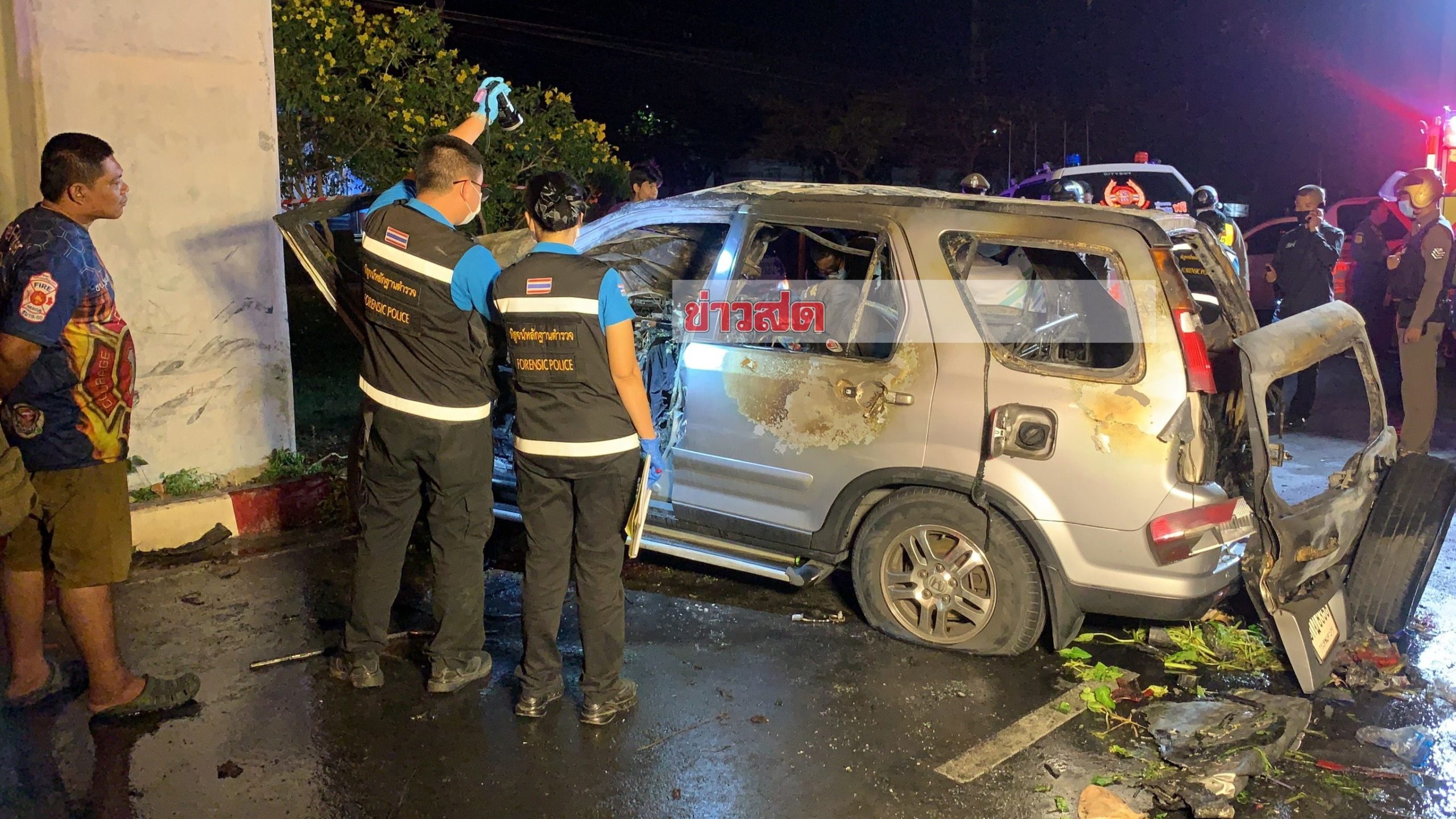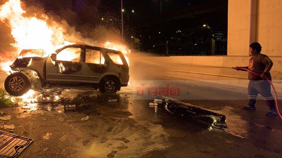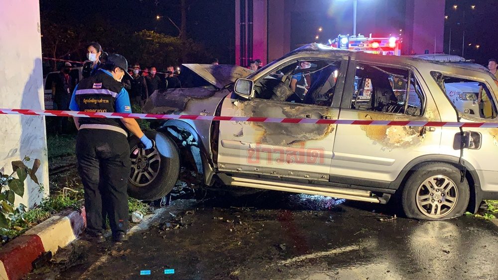 เก๋งซีอาร์วีชนตอม่อรถไฟฟ้า ไฟลุกพึ่บเผาวอดทั้งคัน คลอกสลด 2 ศพ