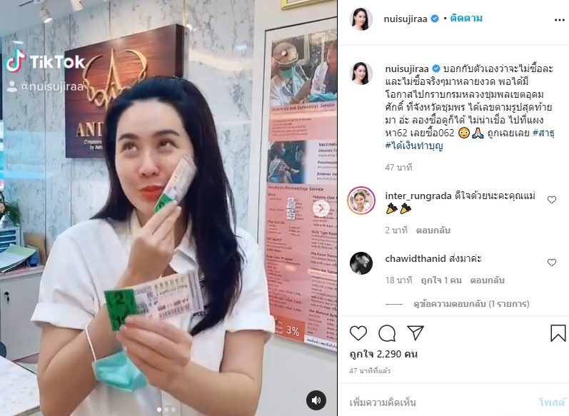 เฮงๆเผยที่มาถูกหวย - คุณแม่ลูกสอง นุ้ย สุจิรา โพสต์ภาพได้เลขเด็ดขณะไปไหว้เสด็จเตี่ยที่ชุมพร หลังผลสลากกินแบ่งรัฐบาลออกมาถูกหวย 4 ใบเลย