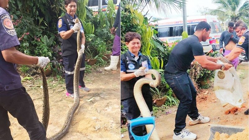 เมื่อไปถึงพบ น.ส.กฤษณา อายุ 52 ปีเจ้าของบ้าน พร้อมช่างประปา พาไปชี้จุดในโพรงใต้ดินซึ่งกำลังขุดวางท่อประปา ก็พบงูเหลือมยักษ์ 2 ตัวอยู่ในโพรง ทีมหน่วยกู้ภัยจึงช่วยกันขุดโพรงดินก่อนใช้อุปกรณ์จับดึงออกมาทีละตัว พบเป็นงูเหลือมขนาดใหญ่ทั้งคู่ ยาวตัวละประมาณ 4.8 เมตร น้ำหนักตัวละกว่า 25 ก.ก. จากนั้นจับใส่กระสอบก่อนนำไปปล่อยป่าห่างไกลชุมชน