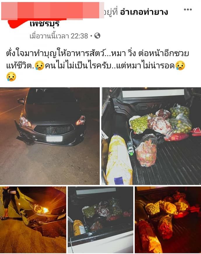 โดยเรื่องนี้ Oranuch Nuch Banyam โพสต์ระบุว่า คุณตั้งใจมาทำบุญแต่สิ่งที่คุณทำคืออะไร!!!??? หมาผิดที่วิ่งตัดหน้ารถคุณ แต่ชนหมาที่ท่ายาง แล้วเอามันทิ้งนอนอยู่ข้างถนนที่ชะอำ ทั้งที่หมายังไม่ตาย!!! สาธุกับบุญที่คุณทำด้วยนะคะ.