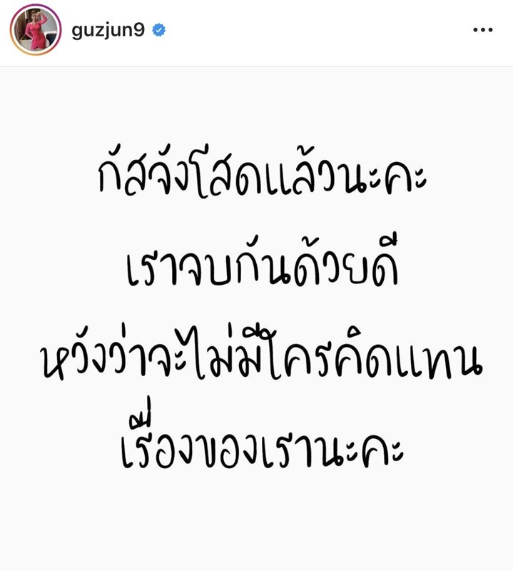 “ส่วนตัวกัสจังอายุเท่านี้แล้วก็อยากจะให้ทุกอย่างดีที่สุด อยากให้ความสัมพันธ์ไปด้วยดี แต่ถ้ามันไม่ดี ไม่ช้าหรือเร็วก็ต้องจบกันอยู่ดี ไม่มีการแบ่งพักแบ่งพวกนะคะ คนเราจากลากันไม่จำเป็นต้องเกลียดกัน ขอบคุณทุกๆ คนนะคะ”